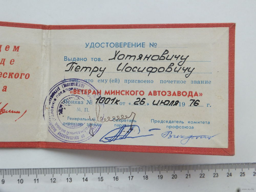 Удостоверение к знаку ветеран минского автозавода МАЗ 1976