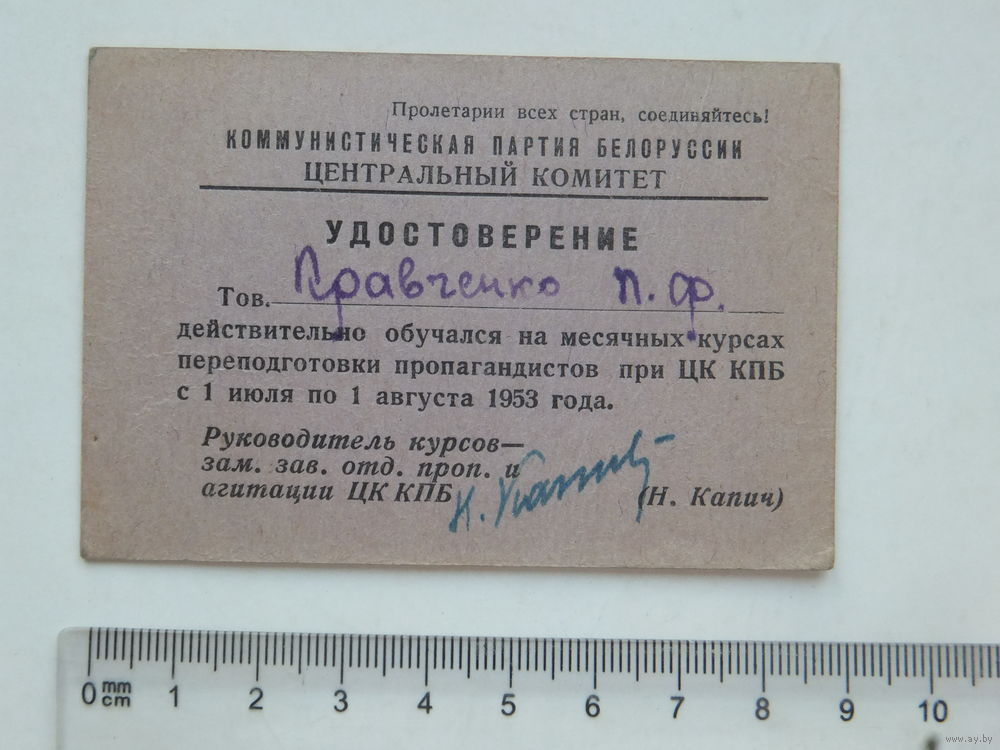 Удостоверение курсы при ЦК КПБ 1953 г