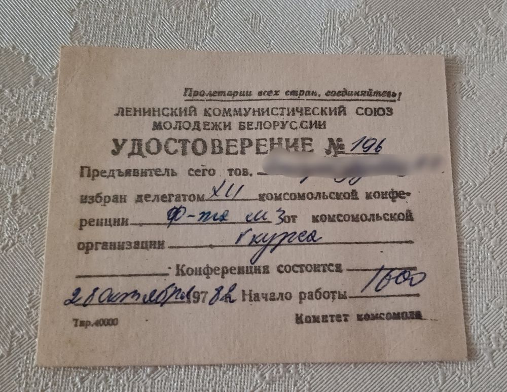 Удостоверение. Ленинский коммунистический союз молодежи Белоруссии. 1982.