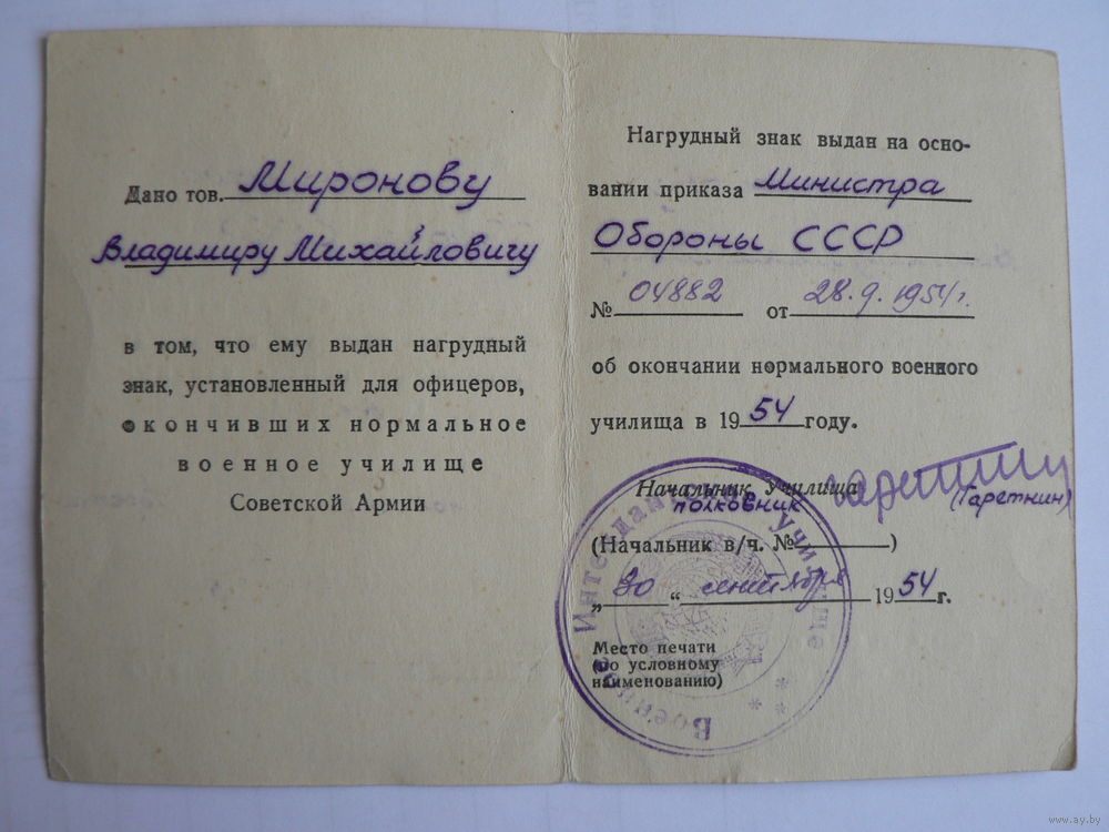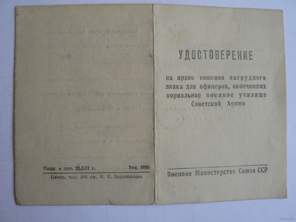 Удостоверение на право ношения нагрудного знака, 1954 г. (Военное Интендантское училище )