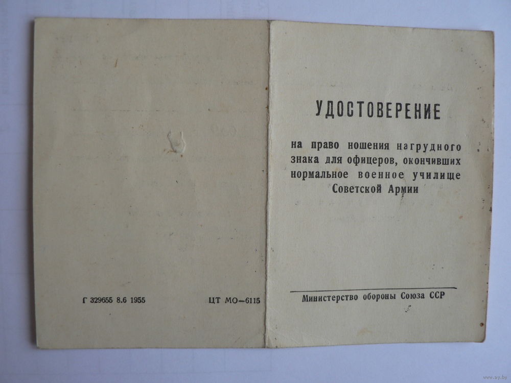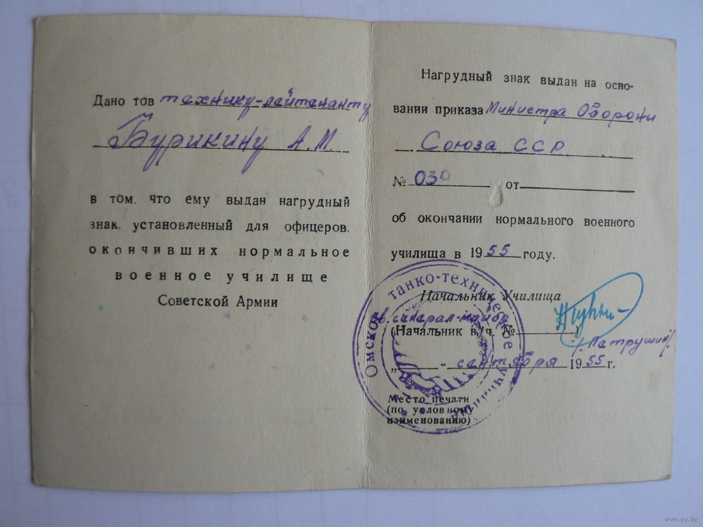 Удостоверение на право ношения нагрудного знака, 1955 г. (Омское танко-техническое училище )