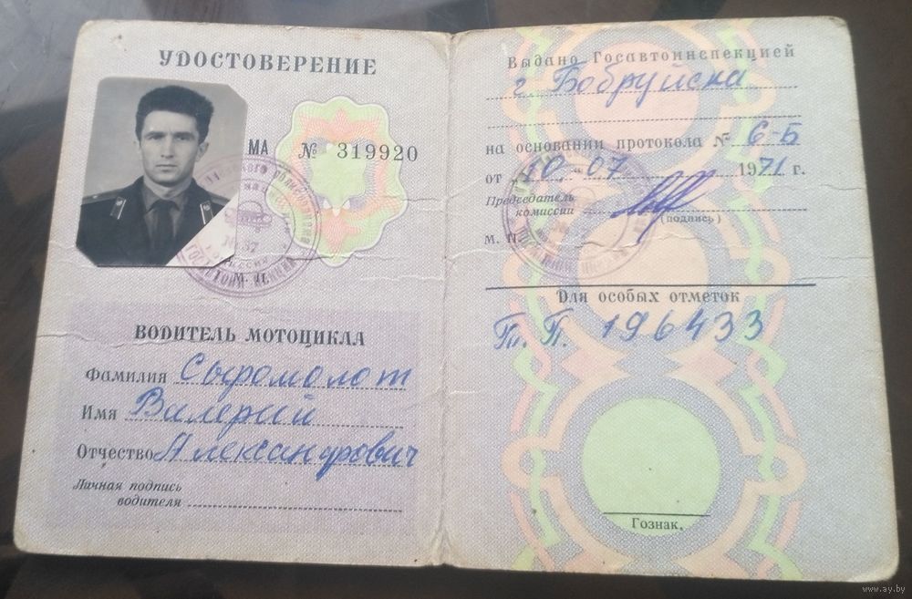 Удостоверение на право управления мотоциклом ГАИ Бобруйск 1971 год