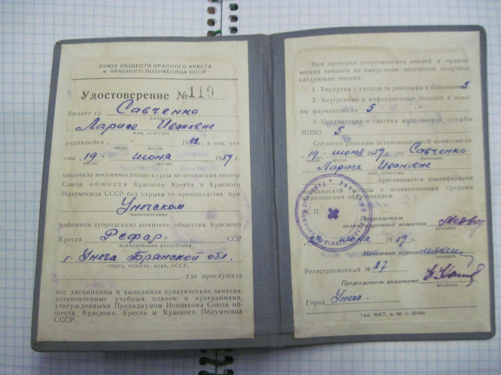 Удостоверение об окончании курсов медицинских сестер 1959 г. с рубля!