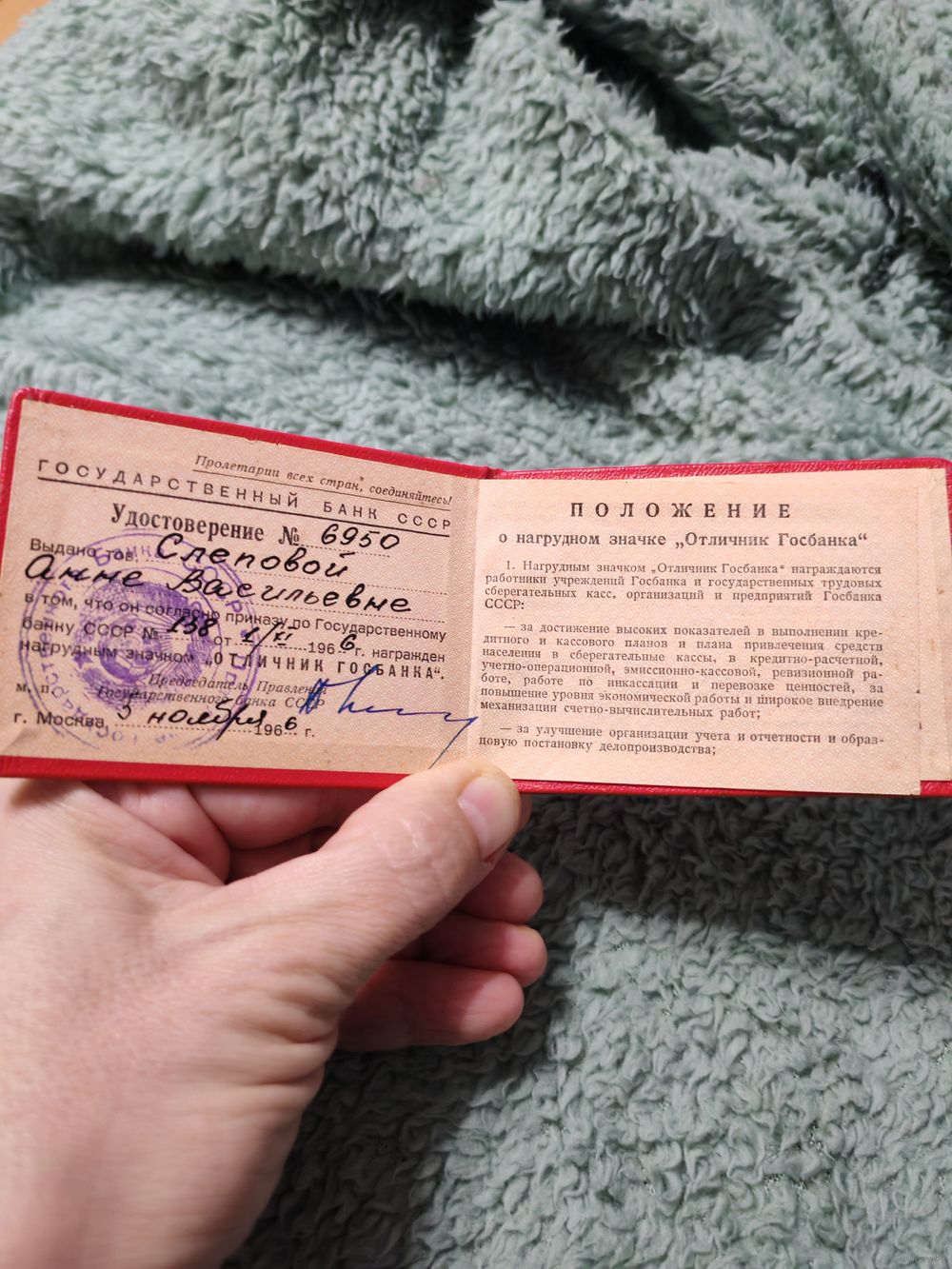 Удостоверение Отличник Госбанка 1966