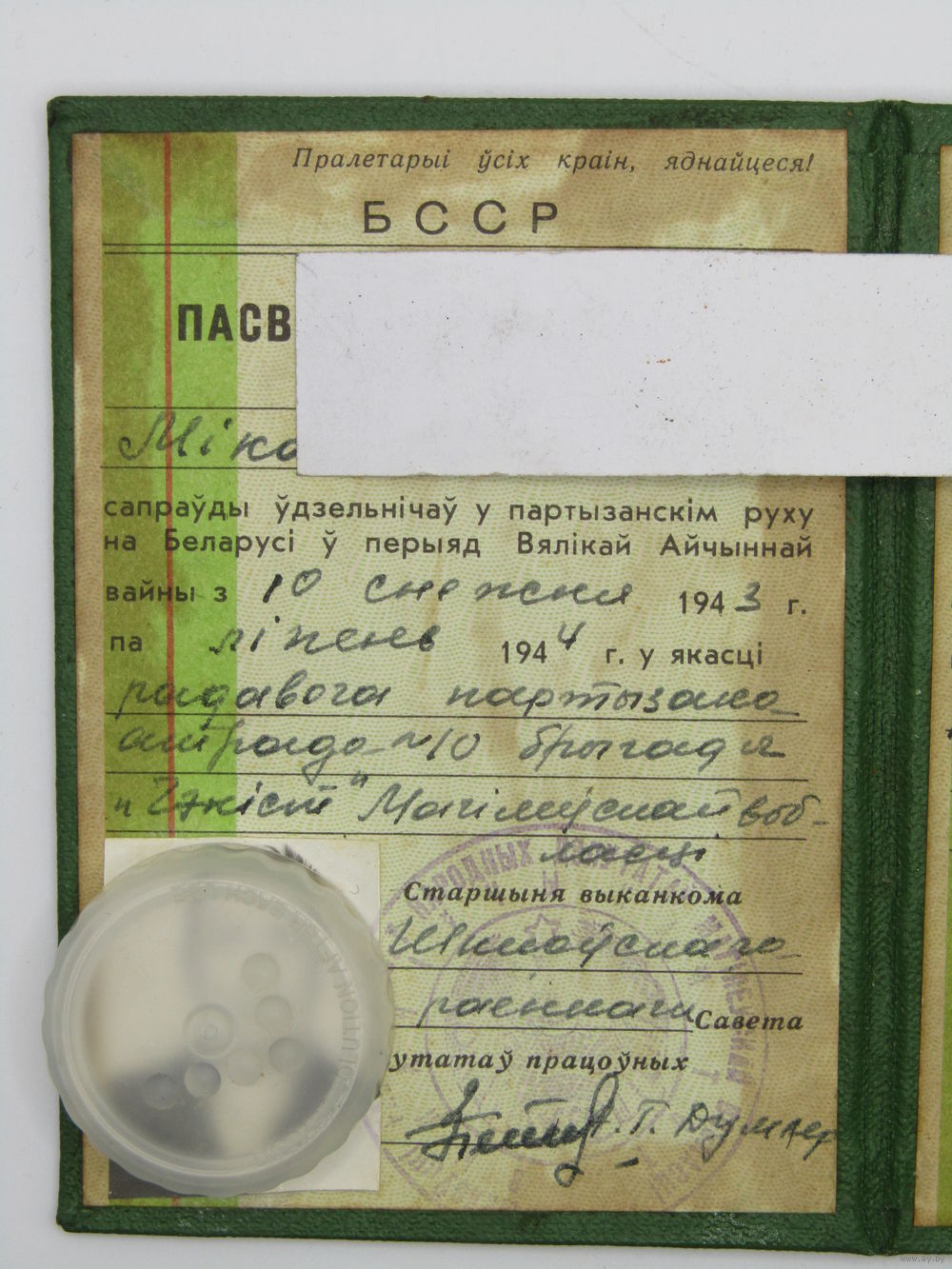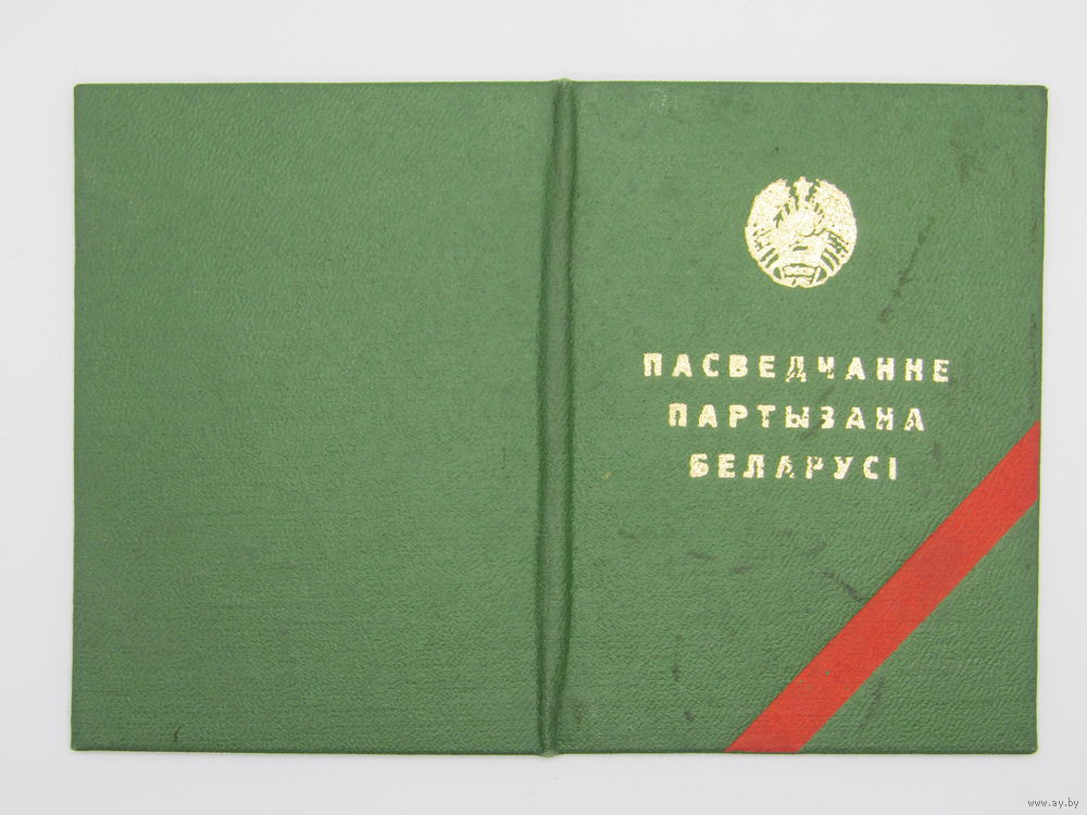 "Удостоверение партизана Белоруссии". "Падсвечанне партызана Беларуси". Оригинал. БССР.