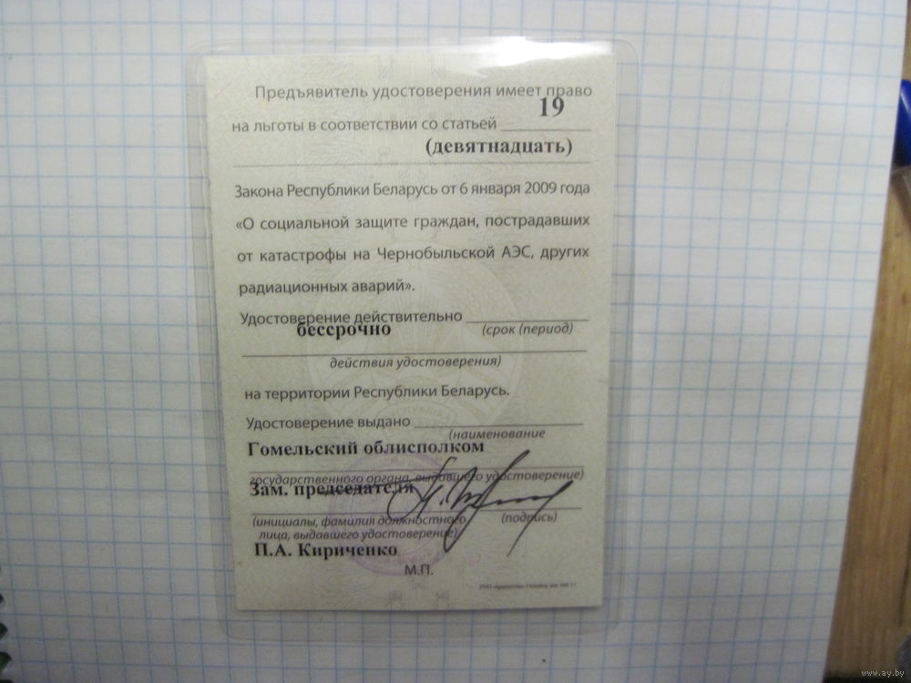 Удостоверение пострадавшего от катастрофы на ЧАЭС 2012 г. известного государственного деятеля БССР и РБ.