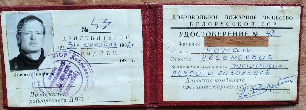 Удостоверение "трубочиста". Минский комбинат противопожарных работ. 1982 г.