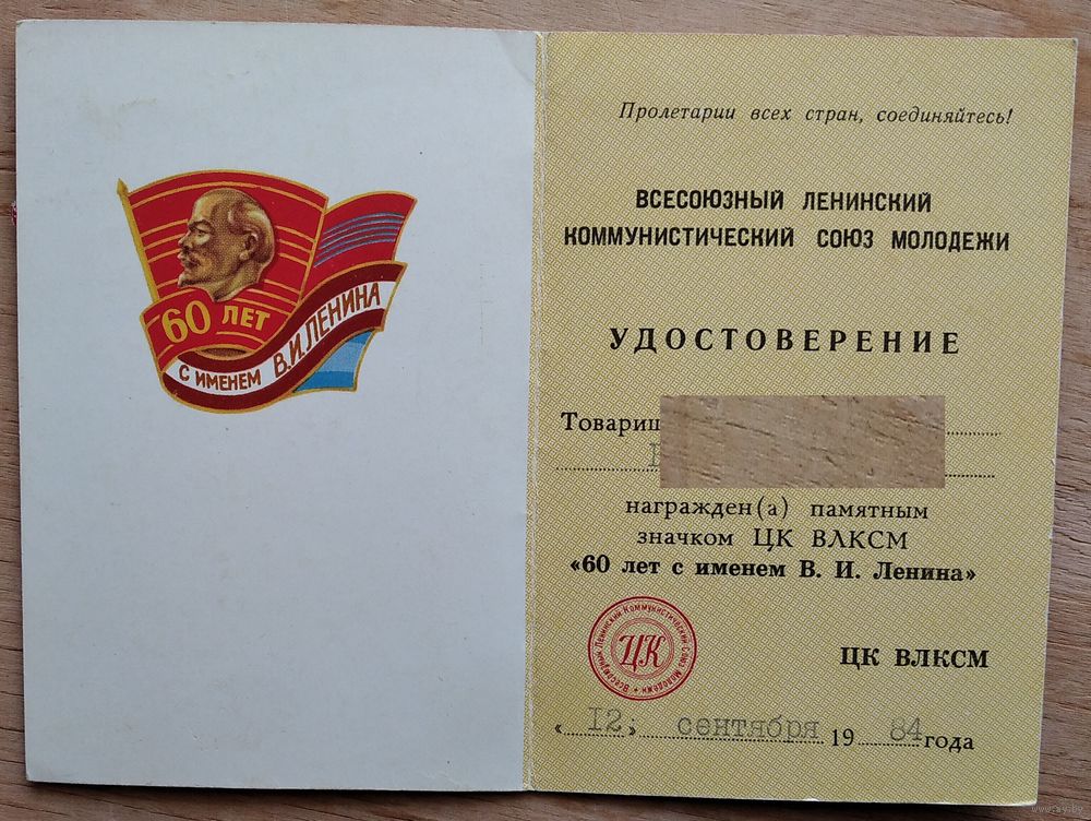 Удостоверение в памятному значку ЦК ВЛКСМ " 60 лет с именем В.И. Ленина ". 1984 г.