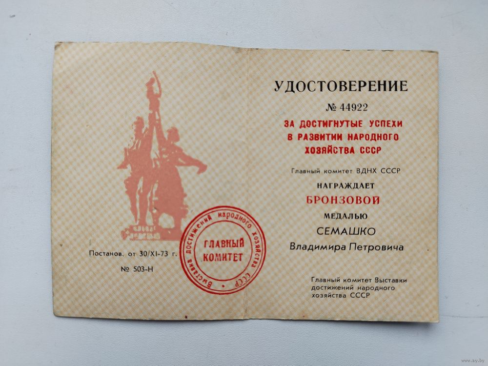 Удостоверение ВДНХ.