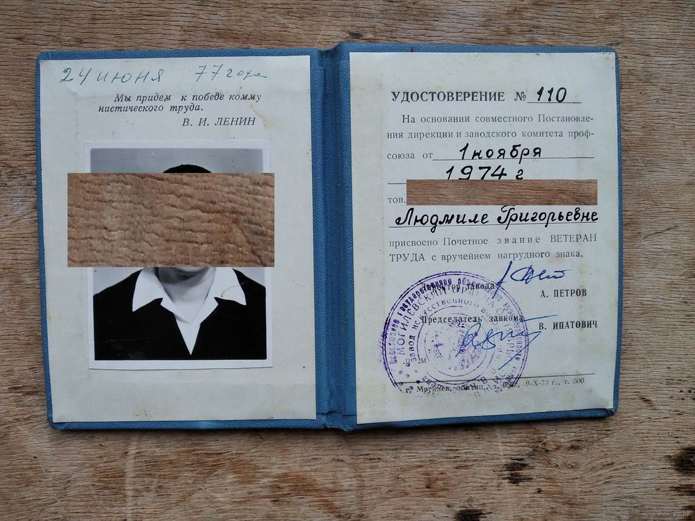 Удостоверение ветерана труда. Могилев. 1974 г.
