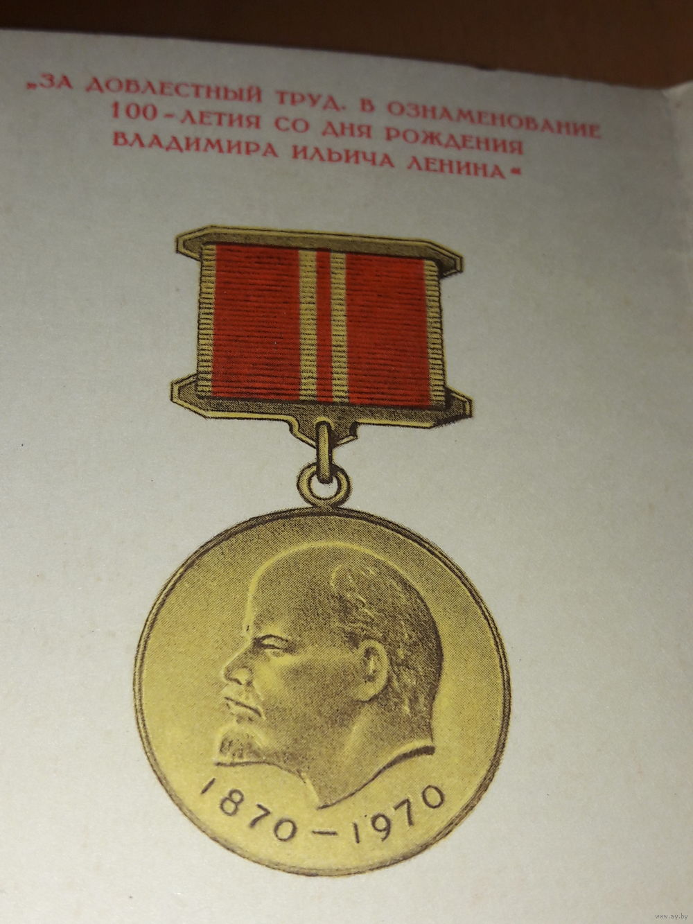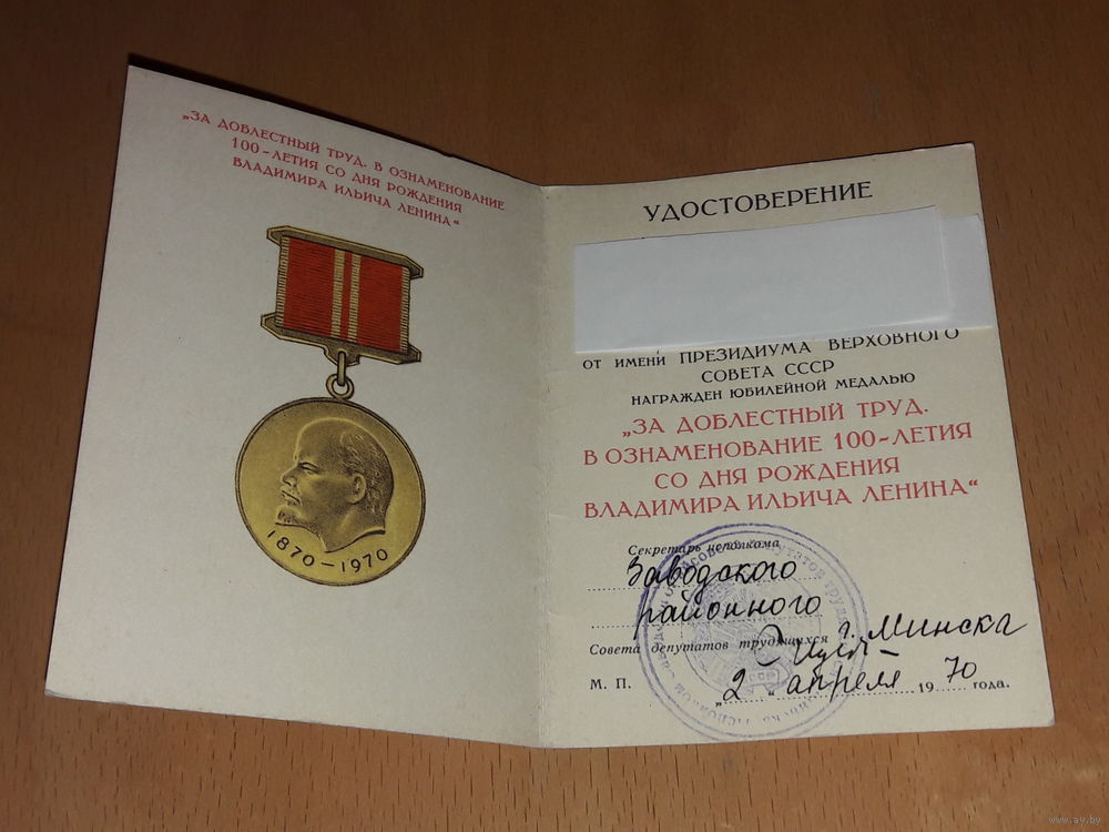 Удостоверение За доблестный труд. 100 лет со дня рождения В.И. Ленина.