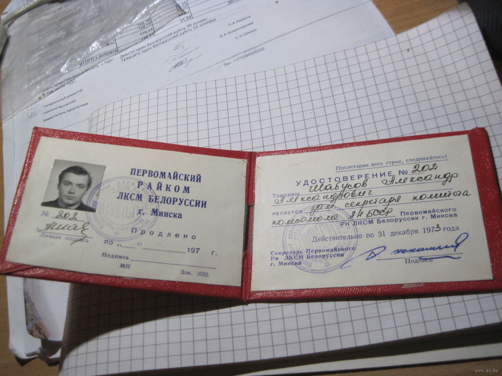 Удостоверение зам. секретаря комитета комсомола АН БССР 1973 г. с рубля!