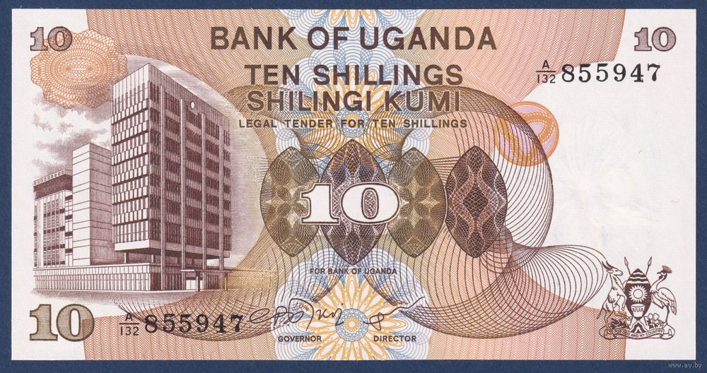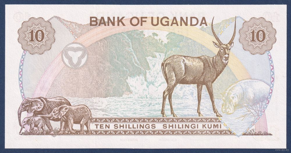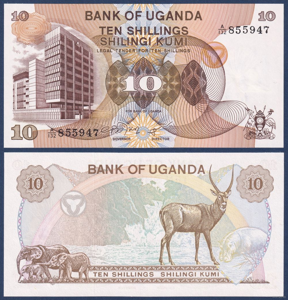 Уганда, 10 шиллингов 1979 г., P-11b (A, слоны, антилопа, бегемот, водопад Мерчисон), UNC