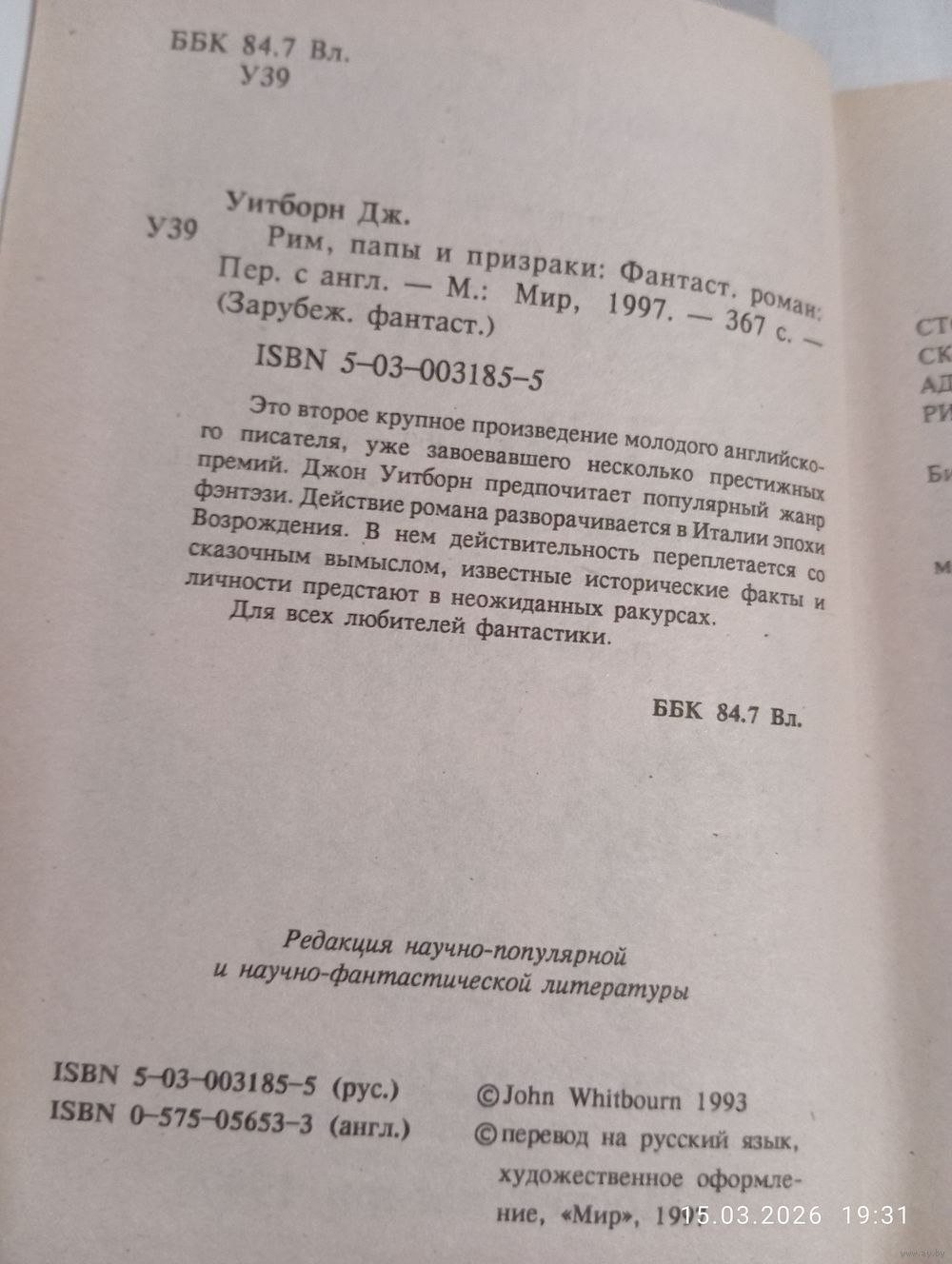 Джон Уитборн. Рим, папы и призраки. Фант роман. Мир 1997. В хорошем состоянии, тв переплет. 367 с. Тираж 10000. Возможность отправки Белпочтой, полная предоплата