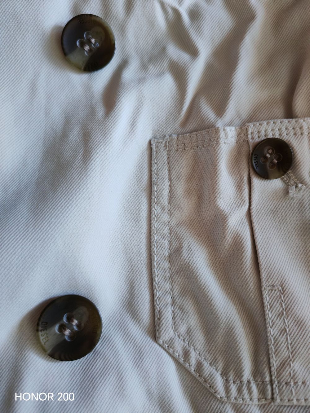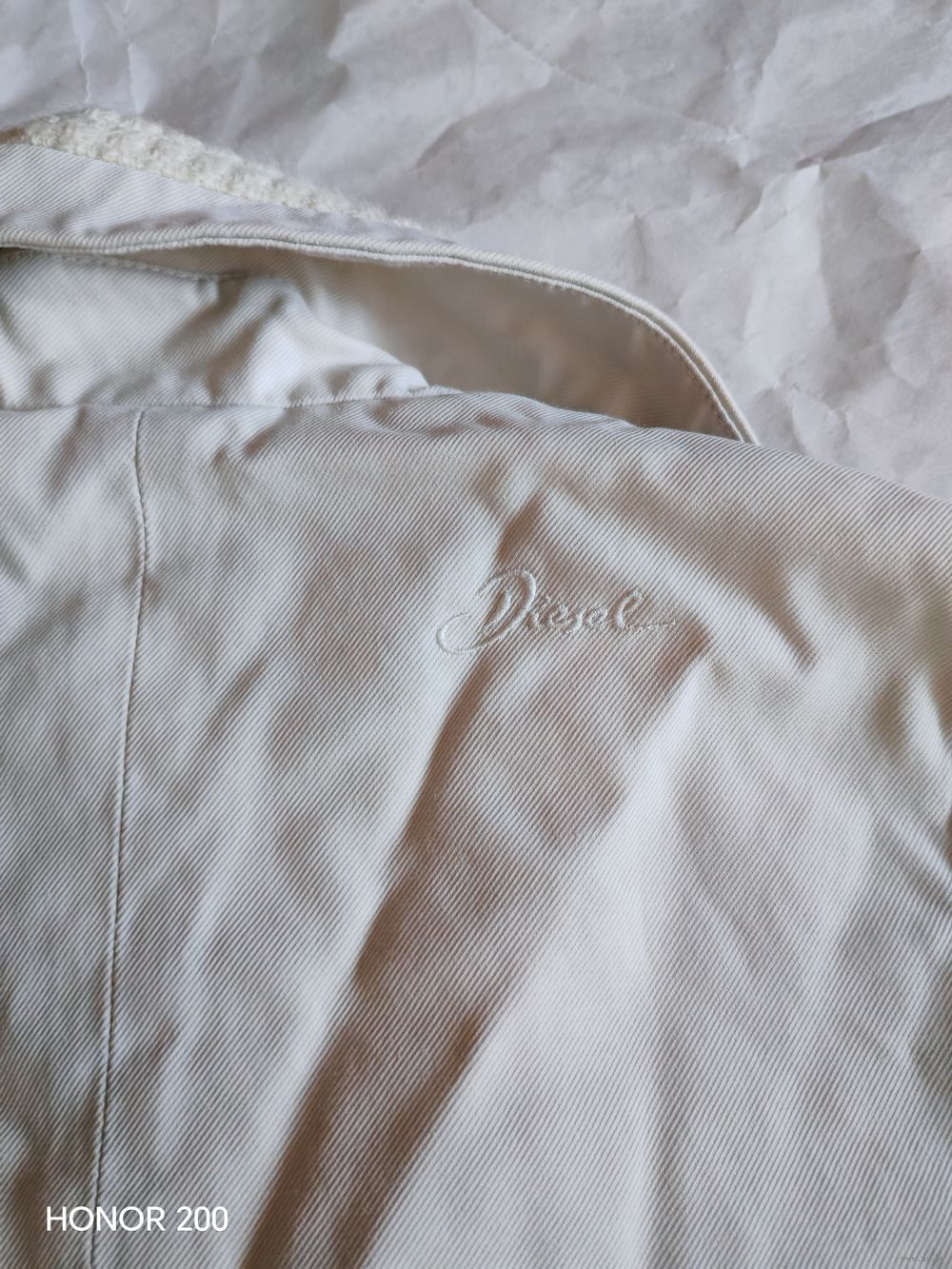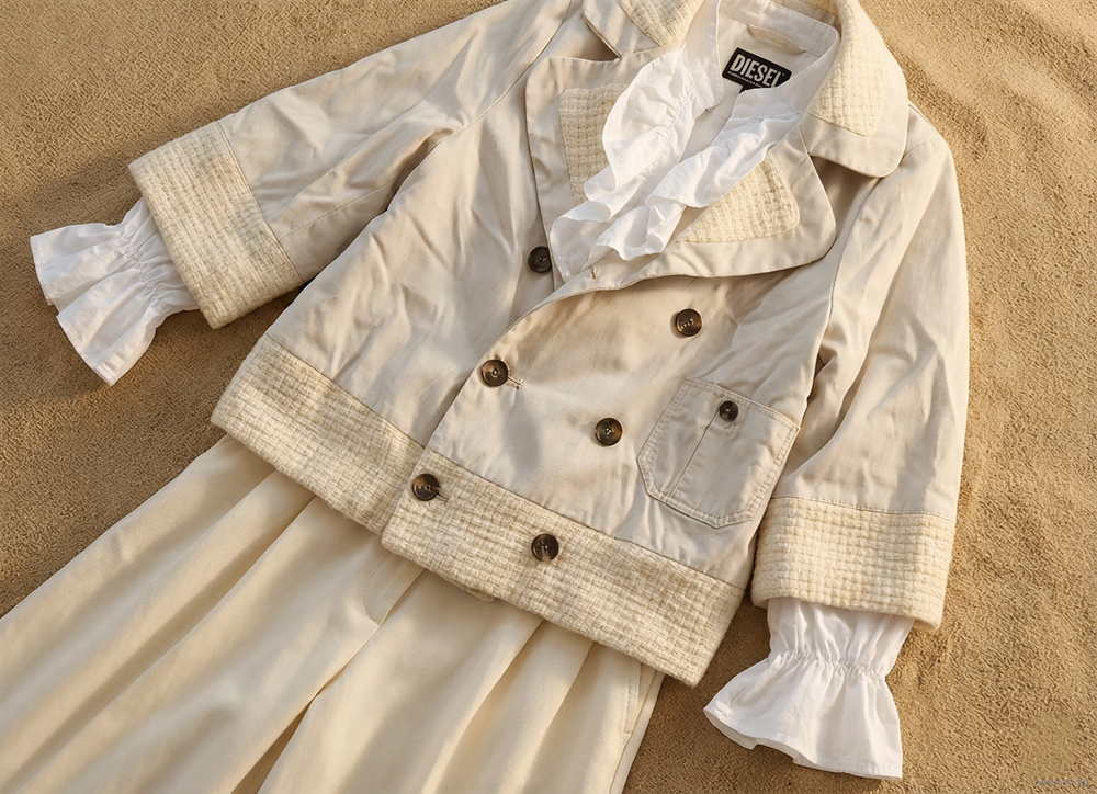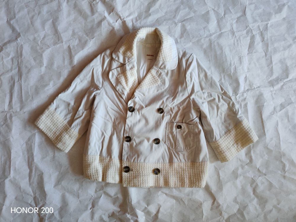 Укороченный жакет от Diesel. Рукав 3/4. Плотный смесовый материал оттенка слоновой кости с уникальными вязаными вставками на воротнике, манжетах и по нижнему краю. Эта игра текстур — визитная карточка Diesel «золотой эры». На подкладке. Массивные контрастные пуговицы с гравировкой бренда, добавляющие образу строгости.