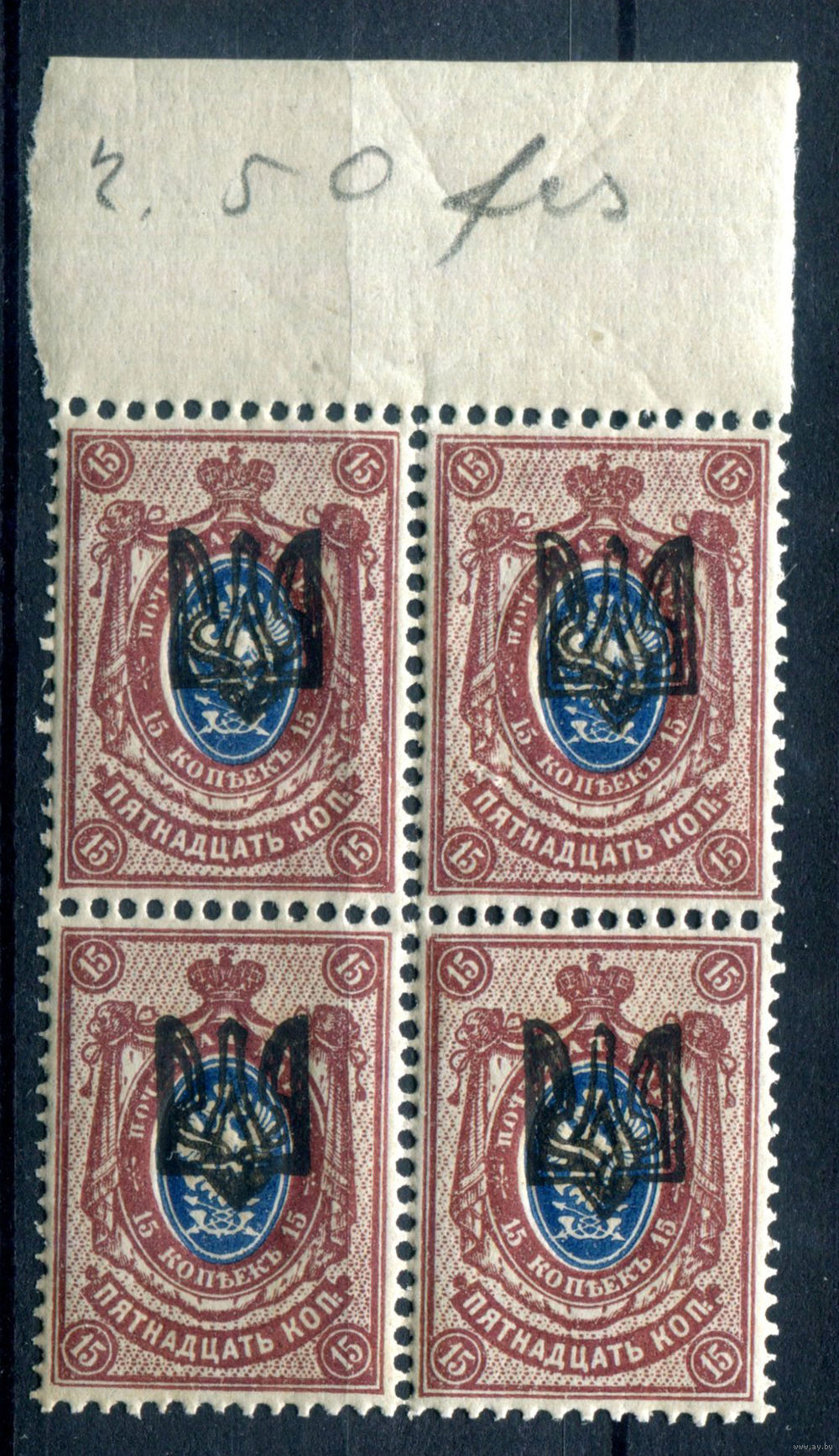 Украина, гражданская война - 1919/20г. - герб, надпечатка трезубец, 15 коп - 1 кварт - MNH, слегка потрескавшийся клей, 1 марка с повреждением клея. #4-W2-108-A-2