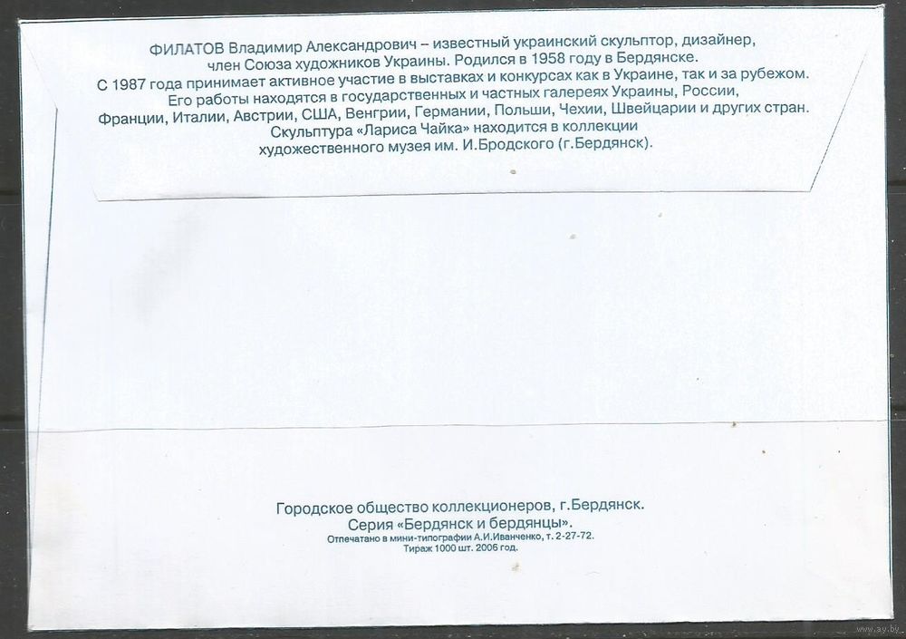 Украина. ХК "Лариса Чайка". Скульптор В.А.Филатов. 2006г. 1 конверт.