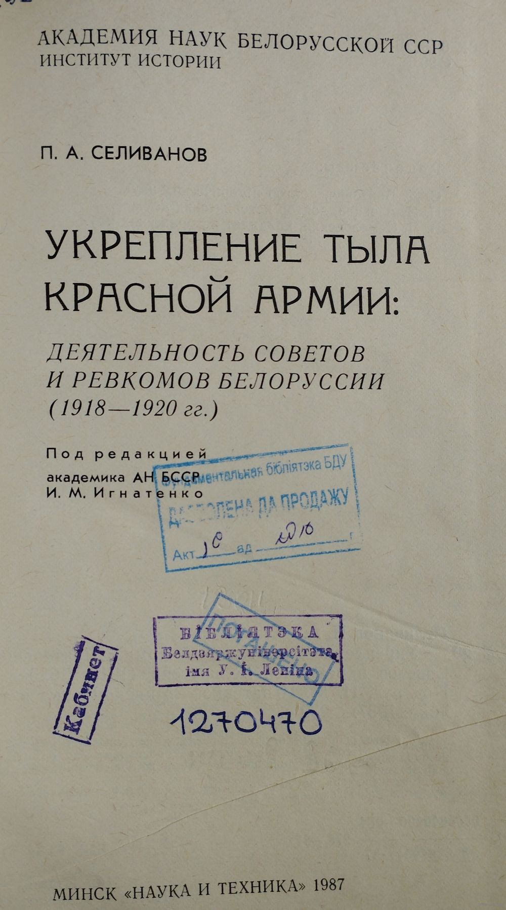 Под ред. И. М. Игнатенко ; АН БССР, Институт истории. Тираж 1000 экз. 240 стр. Тыл Вооруженных Сил - совокупность сил и средств, предназначенных для тылового и по службам тыла технического обеспечения войск (сил) в мирное и военное время. Является важной составной частью Вооруженных Сил, связывающей их с экономическим комплексом страны и во многом определяющей боевую готовность и боевую способность Вооруженных Сил. Несмотря на то, что интерес к истории боевых действий в традиционном понимании несколько снизился, военная история продолжает изучаться в контексте истории политической. Исследуются, в частности, процессы организационного оформления Красной Армии, роль Генерального штаба и особой группы «военспецов» в Гражданской войне.