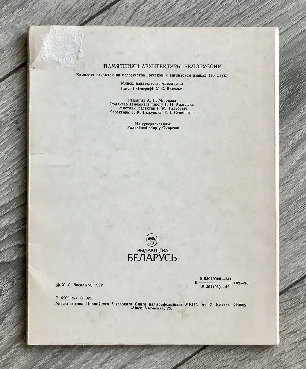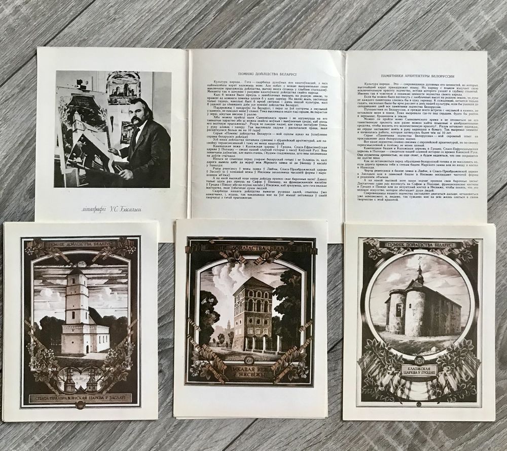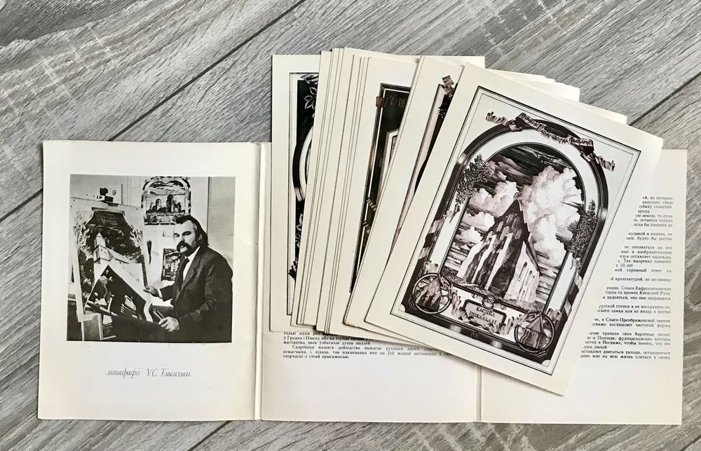 Комплект открыток на белорусском, русском и английском языках с литографиями В. Басалыги, на которых изображены памятники архитектуры Беларуси. 16шт., размер открытки 14,5х18см. Состояние хорошее.