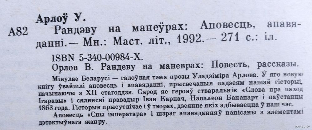 Уладзімір Арлоў. Рандэву на манеўрах: аповесць, апавяданні. Мінск : Мастацкая літаратура, 1992 г 269 с. Цверды пераплет.