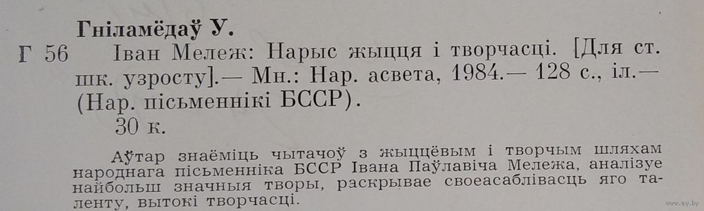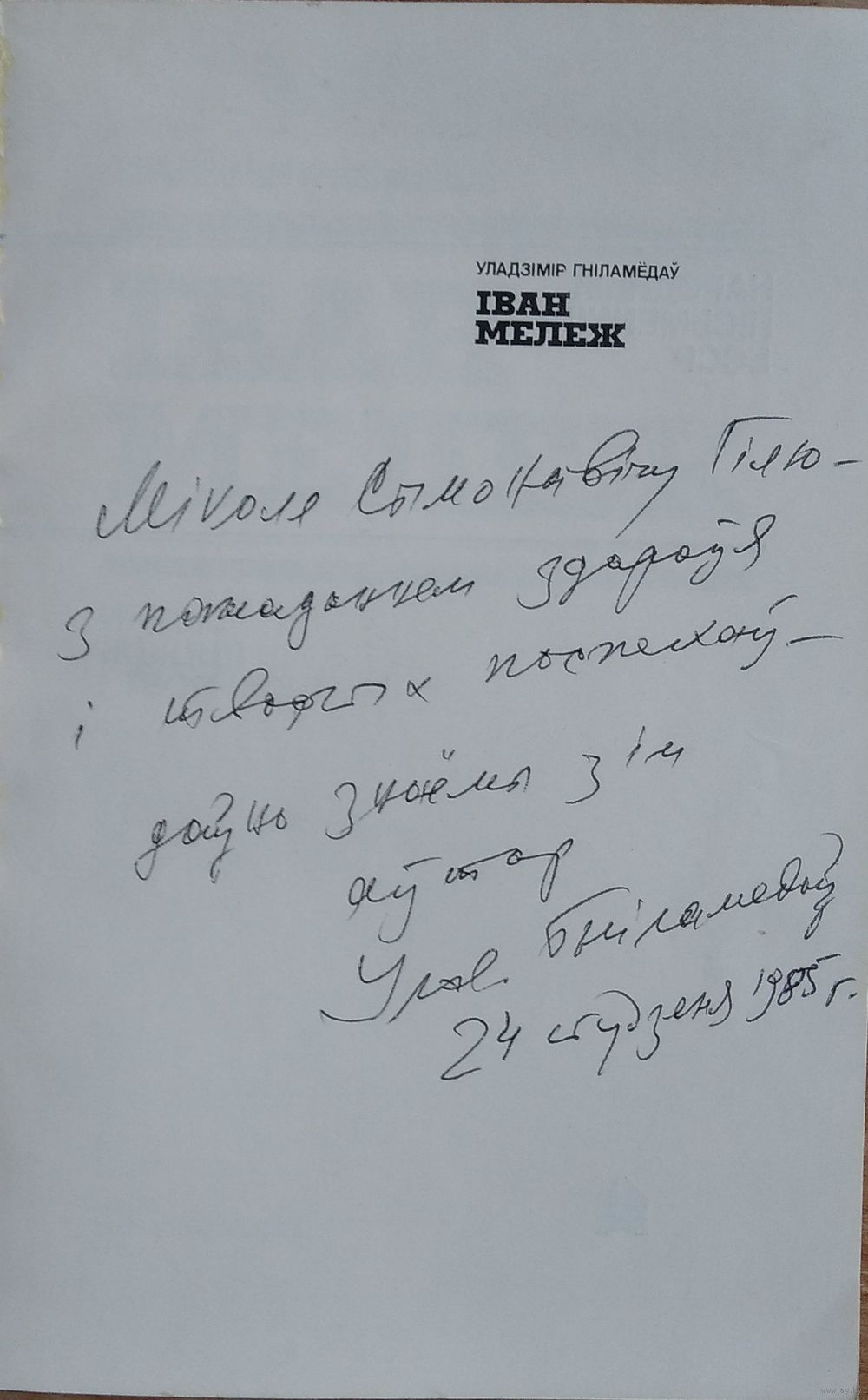 Уладзімір Гніламёдаў. Іван Мележ: нарыс жыцця і творчасці. Народныя пісьменнікі БССР. Аўтограф аўтара. Мінск : Народная асвета, 1984 г. 126 с. Мяккая вокладка.