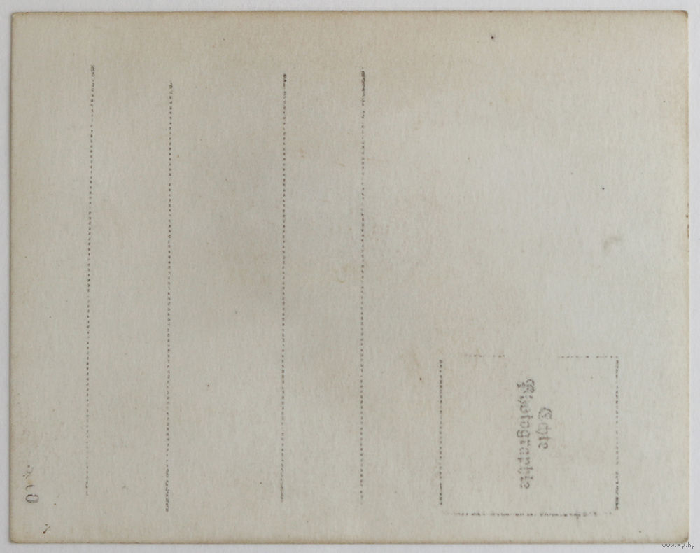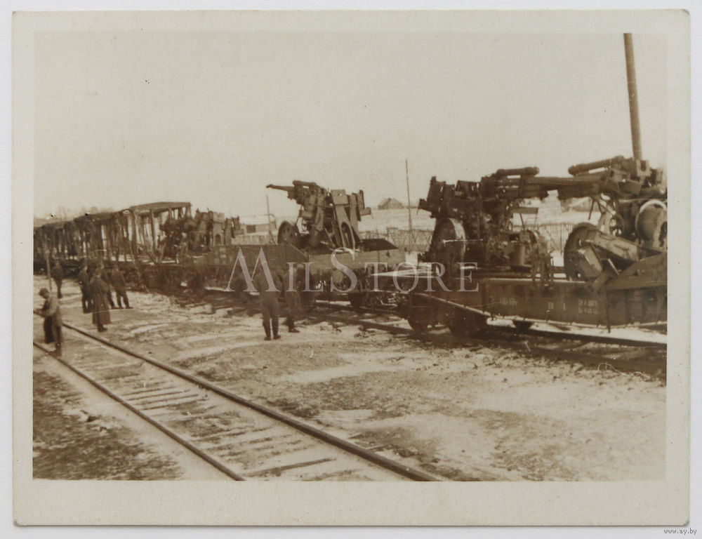 Уничтоженный советский эшелон, сгоревшие вагоны и зенитные 85-мм пушки на платформах. Размер 6,4 см. х 8,4 см.