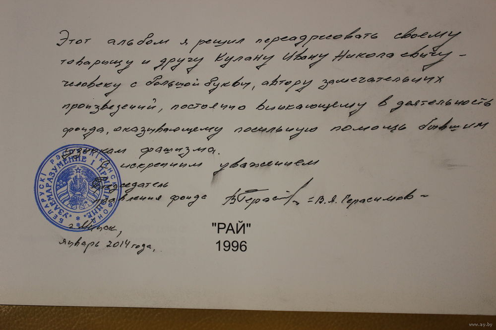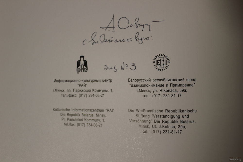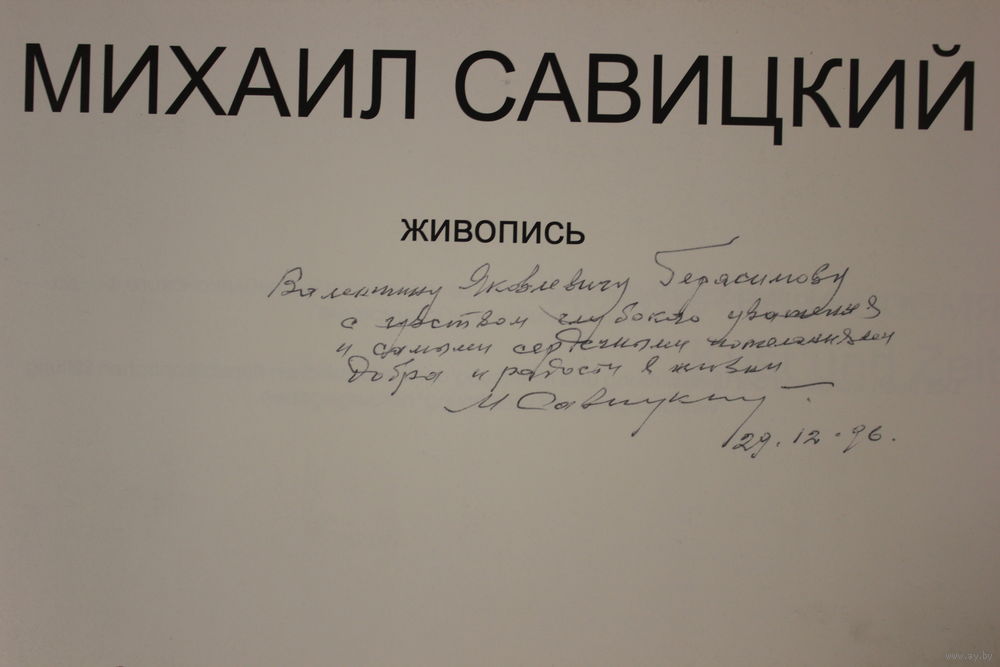 Уникальный экземпляр: три автографа, Андрея Савицкого, единственного сына Михаила Савицкого, который свидетельствует, что это экземпляр # 3, первый и второй экземпляры принадлежали отцу и сыну, Андрей Савицкий также выступил в качестве автора вступительной статьи к альбому, самого Михаила Савицкого с благодарственной надписью председателю правления фонда "Взаимопонимание и примирение" Валентину Яковлевичу Герасимову, как раз на средства этого фонда был издан фотоальбом, и наконец В.Я. Герасимова, который счёл возможным передарить эту книгу своему товарищу и другу Кулану Ивану Николаевичу, а затем видимо родственники Кулана просто сдали ее в букинистику. Вот такая удивительная судьба у этого фотоальбома с работами Михаила Савицкого.