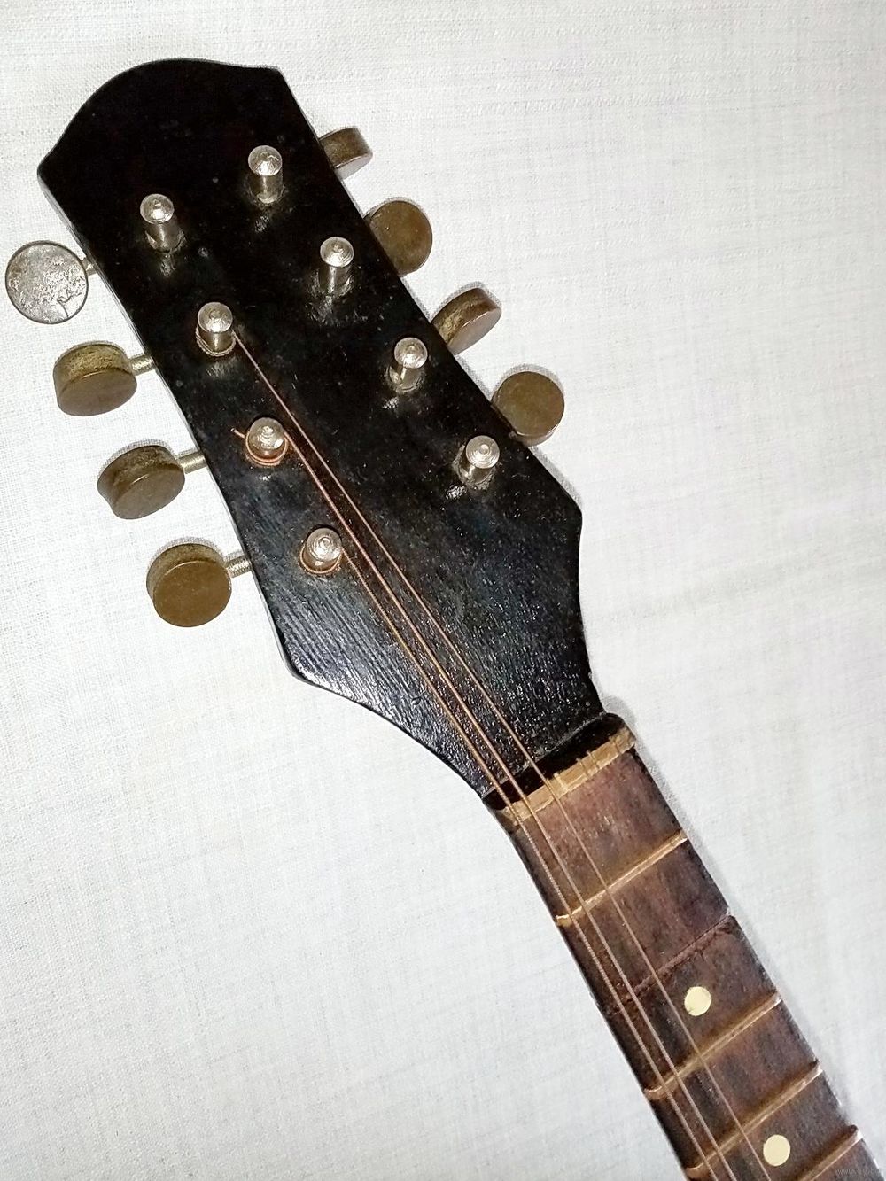 | На фото, корпус рассохся, утрачен 1 лад, склейка грифа. Комплект струн прилагается! Общее впечатление - позитивное! Для фотосессий, киносъёмок, в коллекцию, музей или по назначению - играть !) | |