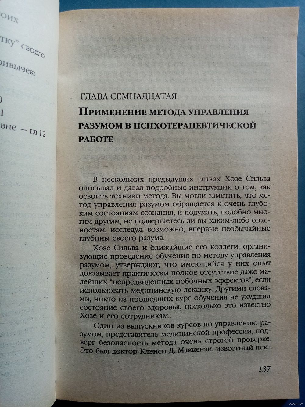 Один из авторов книги — Хозе Сильва — почти всю свою сознательную жизнь посвятил исследованию того, чему можно обучить человеческий мозг. Результат — уникальный МЕТОД СИЛЬВА. Освоив его на 40—48 часовых курсах, любой желающий становился способен: вспоминать то, что кажется начисто забытым; контролировать боль; ускорять выздоровление; избавиться от вредной привычки; развить интуицию настолько, что шестое чувство превращается в созидательную силу, в мощное средство разрешения многих проблем повседневной жизни… Теперь с помощью печатного слова вы получаете возможность на практике освоить всё это, что раньше преподавалось только на специальных курсах.