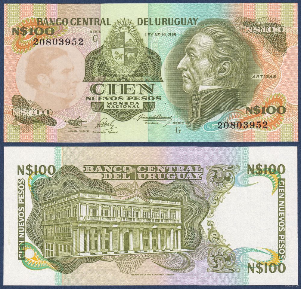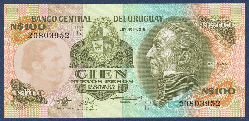 Уругвай, 100 новых песо 1987 г, P-62A (G, генерал Хосе Хервасио Артигас), UNC