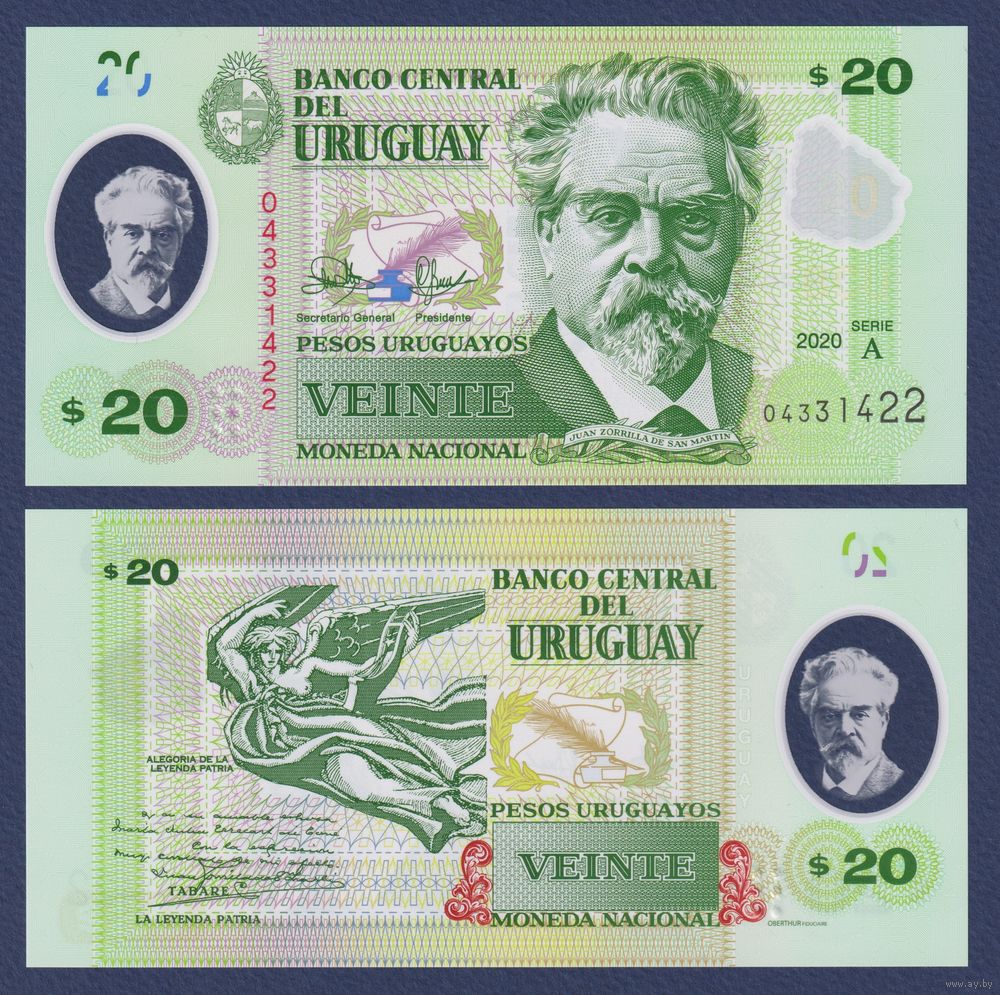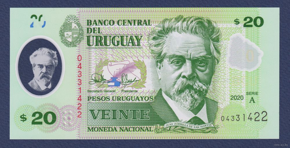 Уругвай, 20 песо 2020 г., P-W101(1) (A, полимер, поэт Хуан Соррилья де сан Мартин), UNC