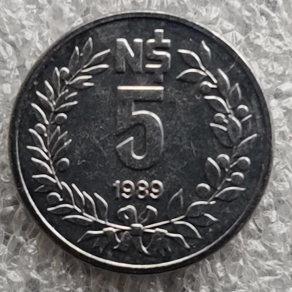 Номер KM # 92 Страна Уругвай Период Новый песо (1975 - 1993) Валюта Уругвайское песо Вид чекана Регулярный чекан Номинал 5 новых песо Год 1989 Гурт Гладкий Форма Круг Отношение авс/рев Медальное (0°) Материал Нержавеющая сталь Вес (g) 1,36 Диаметр (mm) 15 Толщина (mm) 1
