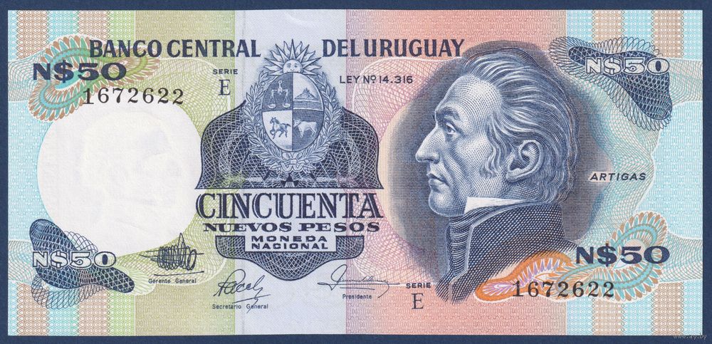 Уругвай, 50 новых песо 1978-1987 г., P-61d (Serie E, генерал Хосе Хервасио Артигас), UNC