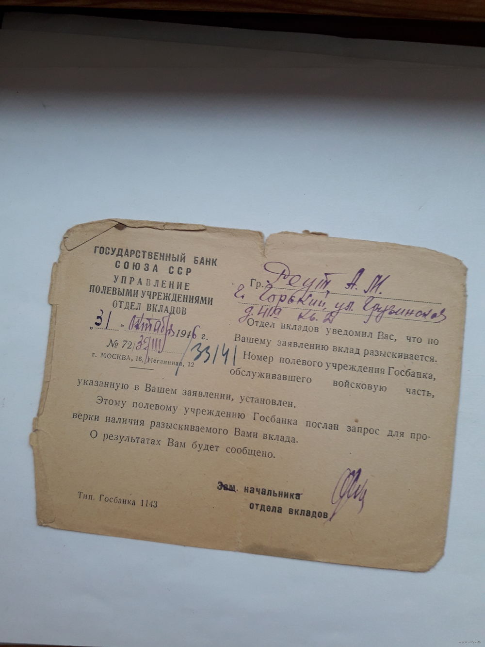 Уведомление Госбанк СССР Управление полевыми учреждениями 1946