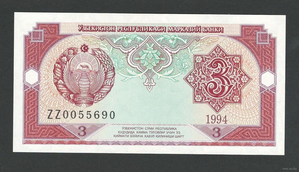 Узбекистан 3 сум 1994 года. Серия ZZ. Состояние UNC