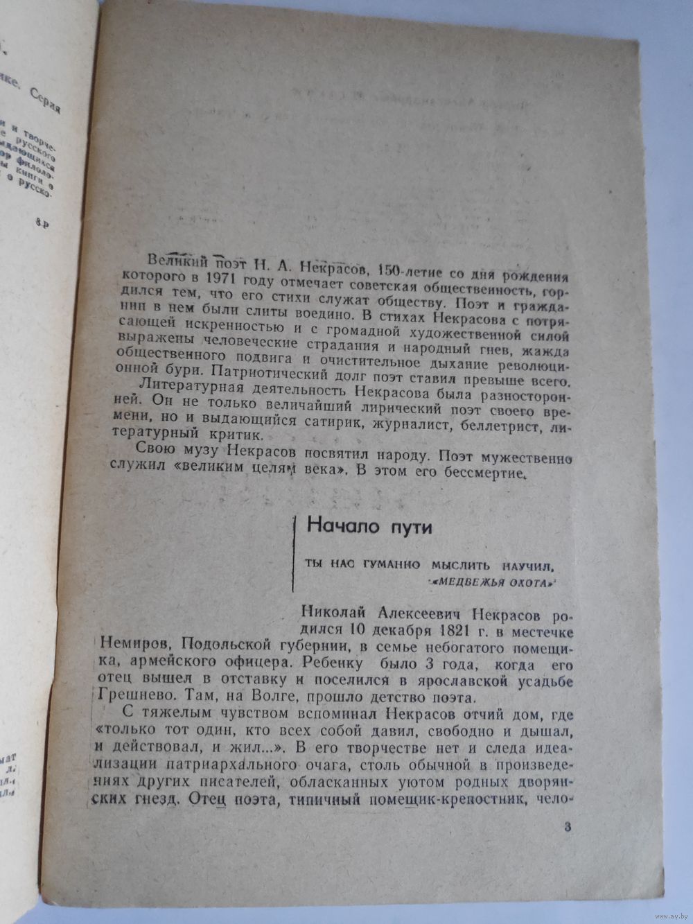 В брошюре освещены самые важные узловые моменты из жизни и творчества Некрасова, говорится о влияния его поэзии на формирование русского революционного мировоззрения, Особое внимание уделено анализу выдающиеся произведений поэта, их художественные особенностей, Автор - доктор филологических наук, профессор Воронежского университета, Им написаны книги о Некрасове, статьи о Писемском, Лермонтове, Никитине, монография о русско- украинских литературных связях,