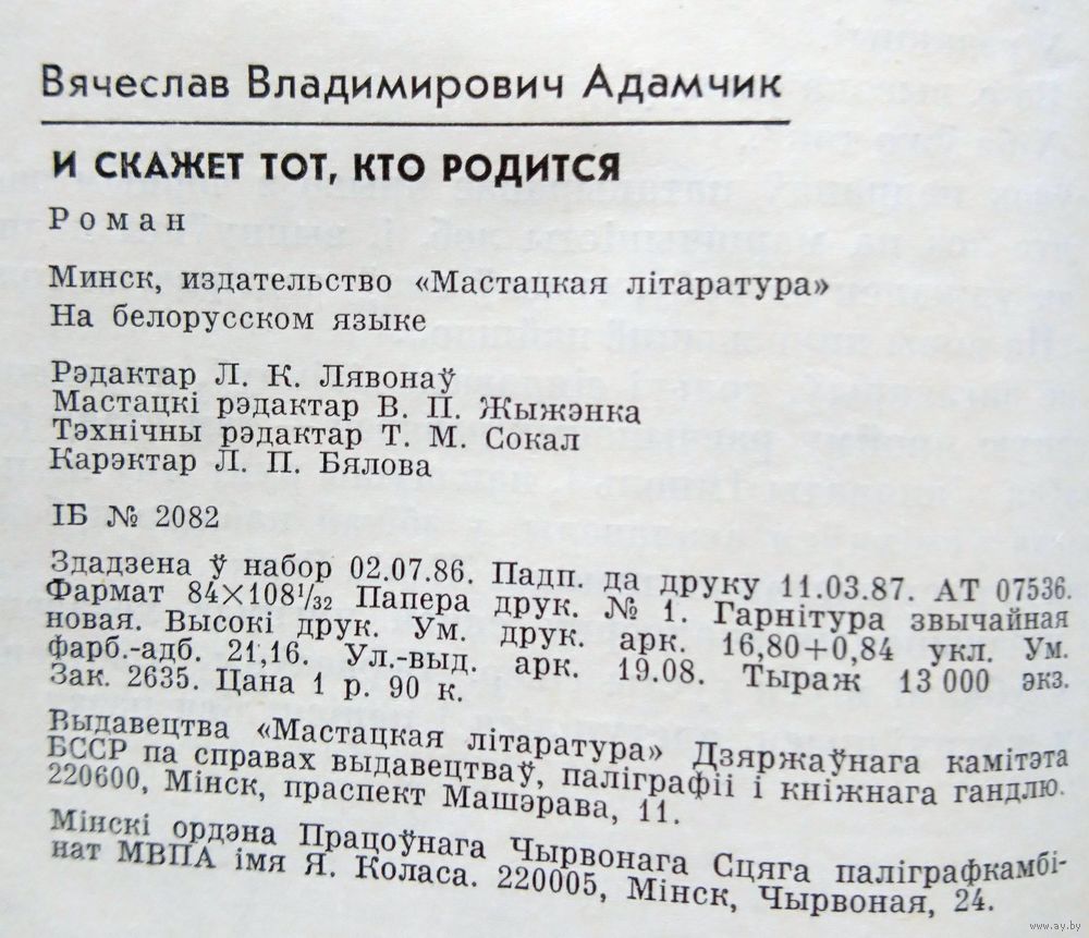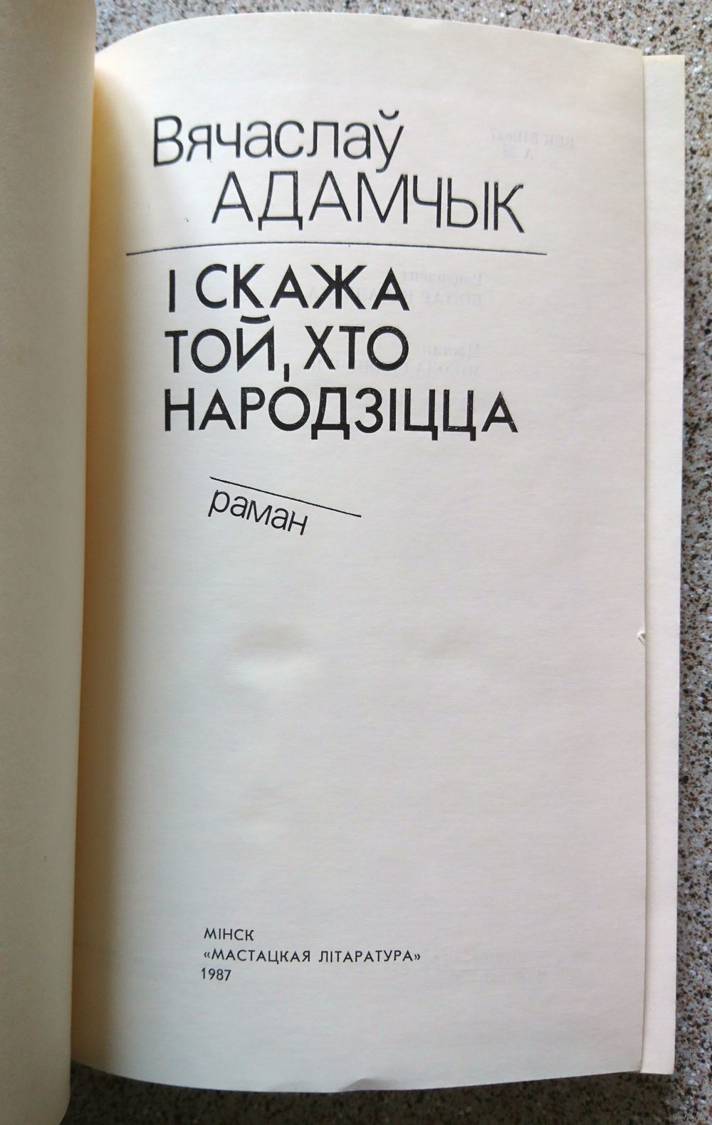 Адамчык В. І скажа той, хто народзіцца : раман / Вячаслаў Адамчык. — Мінск : Мастацкая літаратура, 1987. — 318, [1] с., [8] л. каляр. іл.