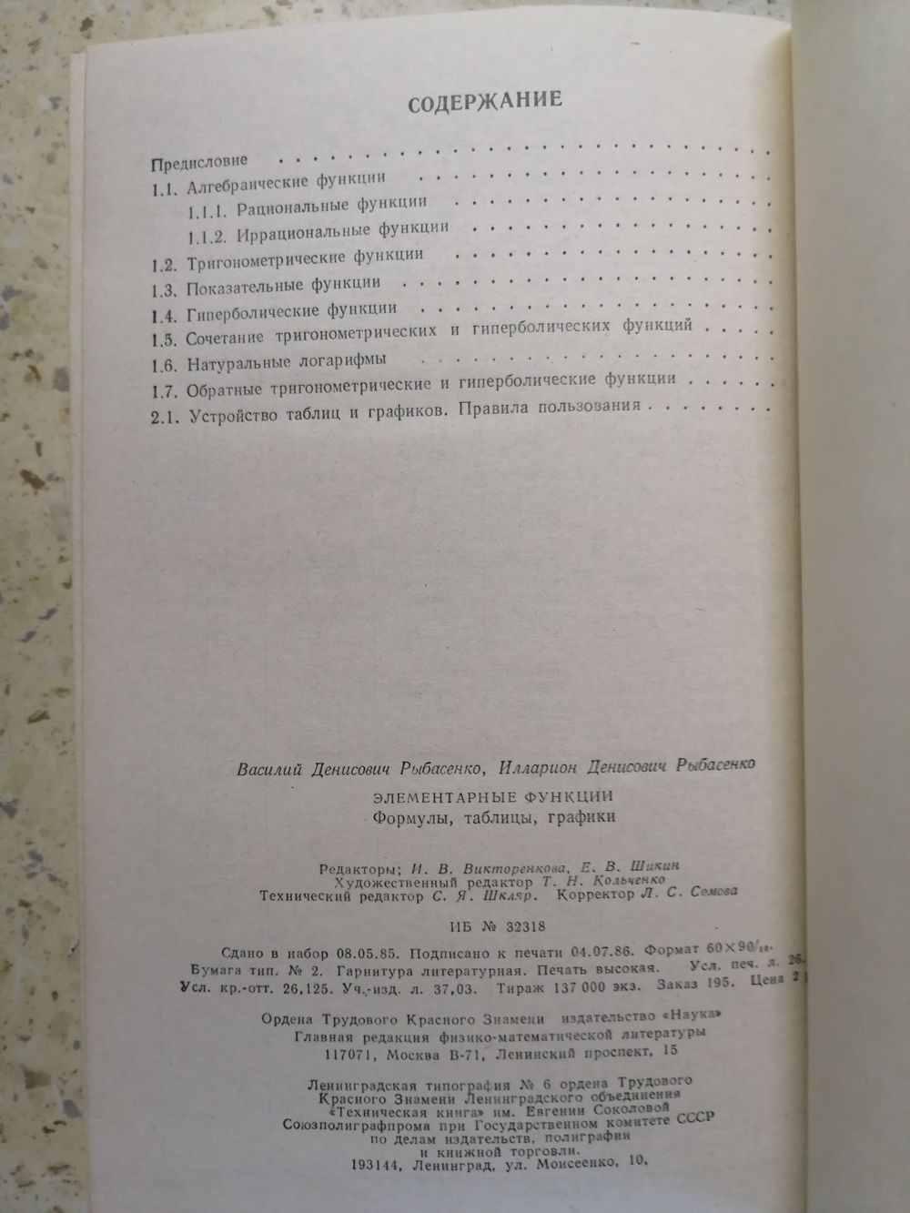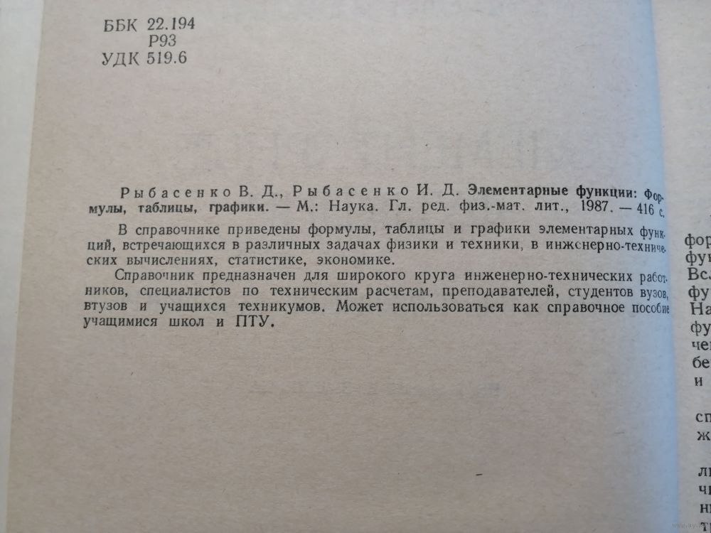 В справочнике приведены формулы, таблицы и графики элементарных функций, встречающихся в различных задачах физики и техники, в инженерно-технических вычисления, статистике, экономике.