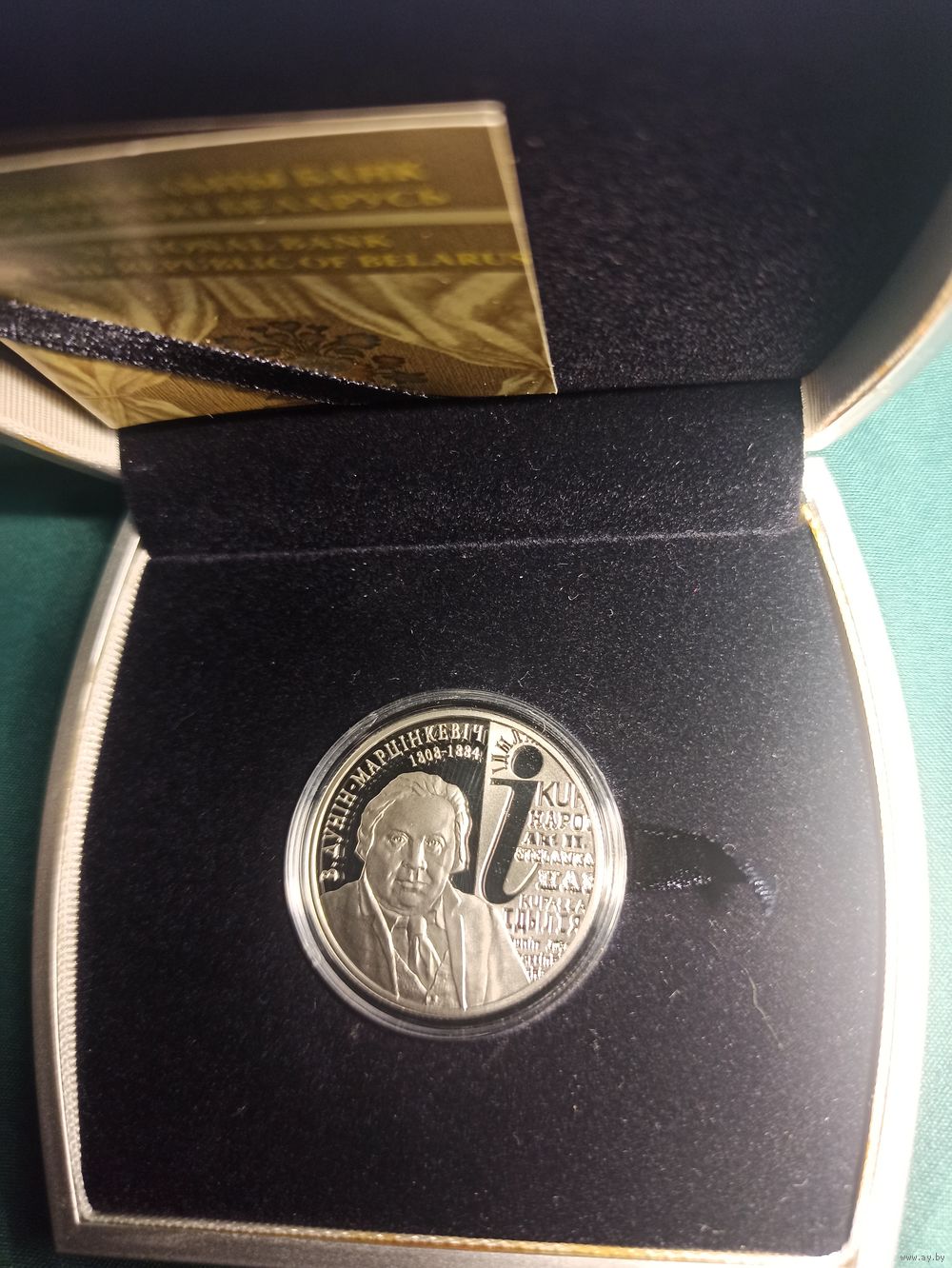 Реверс: в центре – рельефное изображение портрета белорусского драматурга В. Дунина–Марцинкевича; справа – фрагменты театральных афиш; вверху слева по кругу в две строки надписи: В.ДУНІН–МАРЦІНКЕВІЧ и годы жизни 1808–1884. Цена указана на монету без подарочного футляра. При покупке с футляром оплата дополнительно +20р.