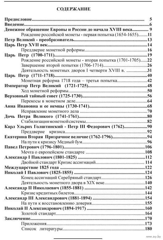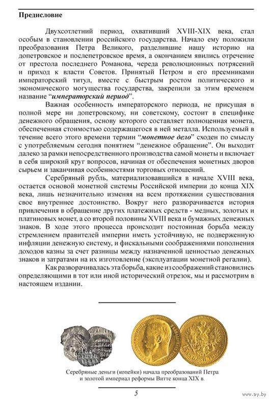 В книге исследуется монетное дело в России со времени его зарождения при Петре I до конца правления Николая II. Подробно рассматриваются периоды царствования каждого правителя, дается развернутое описание и анализ причин, которые так или иначе влияли на монетное дело, а так же исследуется обратное влияние изменений в денежном обращении на различные стороны общественной жизни. Приводится большое количество рисунков и фотографий монет из собрания автора, а так же использованы ссылки на "Базовый каталог" издательства Конрос (Кон. N/N), в котором дается подробная информация по монетам этого периода.