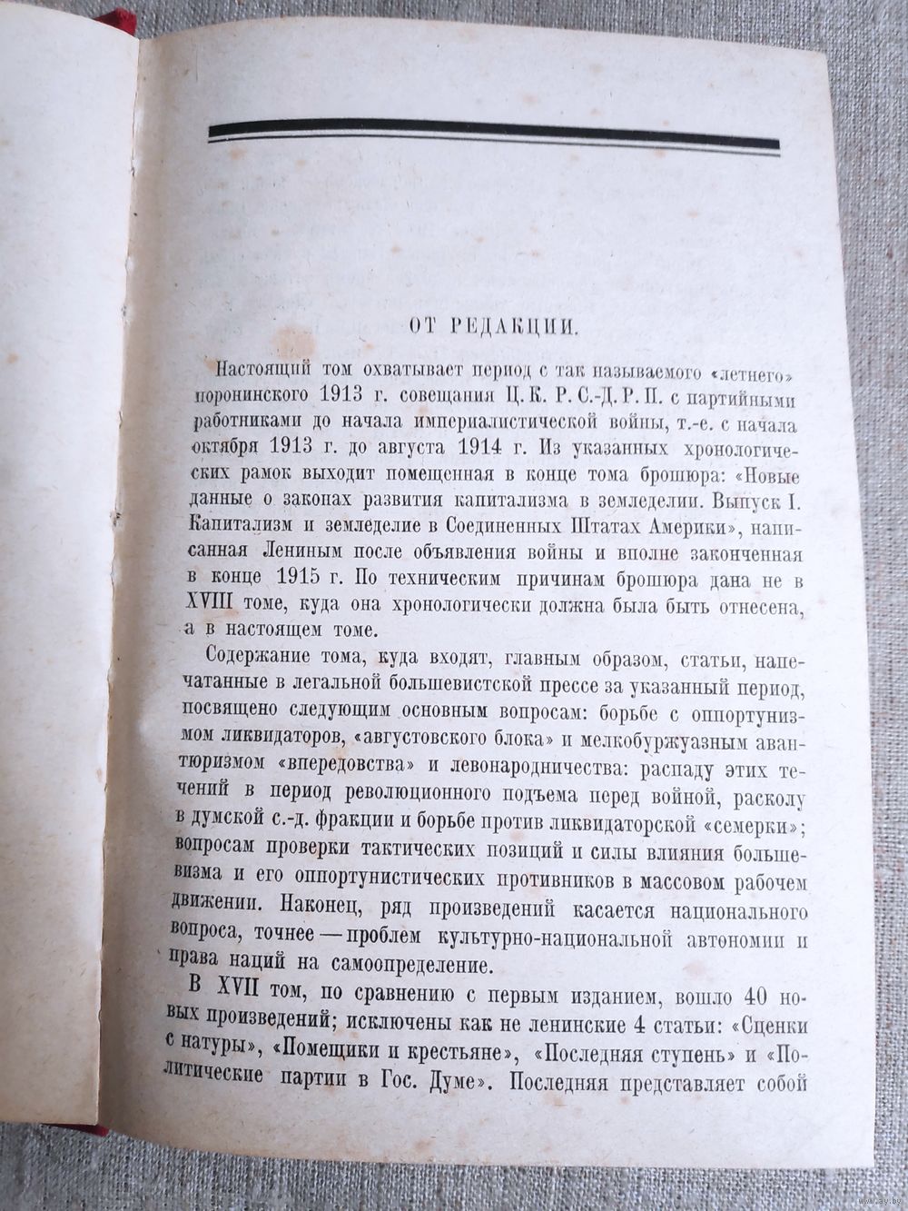 Сочинение В. И. Ленина том 17 1932 года. Автор В. И. Ленин, под редакцией Н. И. Бухарина, В. М. Молотова, М. А. Савельева. Формат средний 135 х 200 мм. Количество страниц: 830 стр. Типографский переплет.