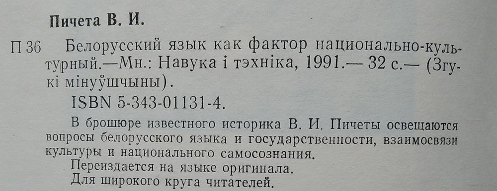 В. И. Пичета. Белорусский язык как фактор национально-культурный. Серыя: Згукі мінуўшчыны Минск. Навука і тэхніка, 1991 г. 30 c. Мягкая обложка.