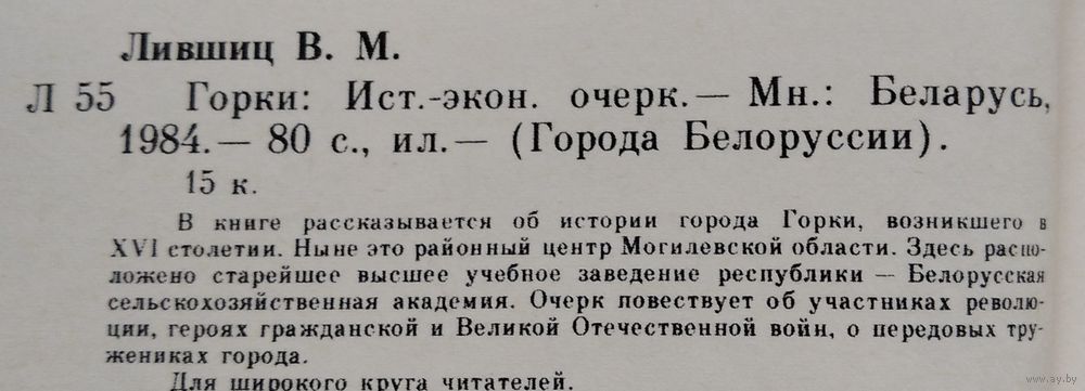В. М. Лившиц. Горки: историко-экономический очерк. Серия: Города Белоруссии. Минск : Беларусь, 1984 г. 77 с. Мягкая обложка.