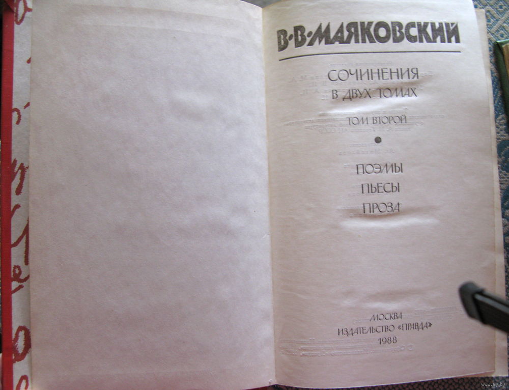 Во втором томе – ПОЭМЫ: Облако в штанах. – Флейта-позвоночник. – Война и мир. – Человек. – 150 000 000. – Люблю. - IV Интернационал. - Пятый Интернационал. – Про это. - Рабочим Курска, добывшим первую руду, временный памятник работы Владимира Маяковского. – Владимир Ильич Ленин. – Летающий пролетарий. – Хорошо ! – Во весь голос. - (Неоконченное). ПЬЕСЫ: - Владимир Маяковский. – Мистерия-буфф (Второй вариант). – Клоп. – Баня. ПРОЗА: - Умер Александр Блок. - В. В. Хлебников. – Париж. Быт. – Семидневный смотр французской живописи. - Собирайте историю. - С неба на землю. - О мелочах. – `А что вы пишете ?`. – Как делать стихи? – Ездил я так. - Рожденные столицы. – Письмо Равича и Равичу. - Из выступления в Доме комсомола Красной Пресни на вечере, посвященном двадцатилетию деятельности, 25 марта 1930 года. Примечания А. Ушакова. Алфавитный указатель произведений.