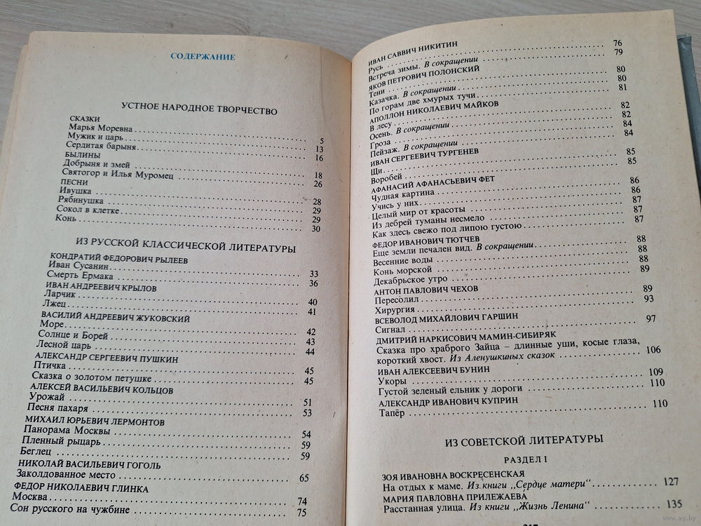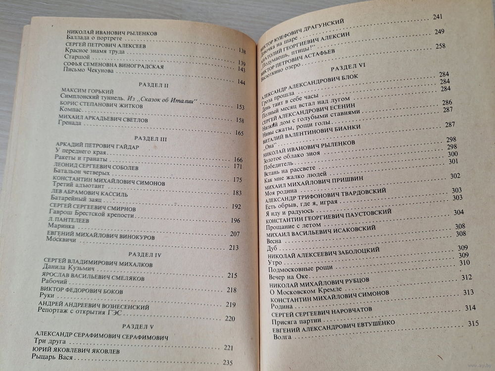 | Автор | Крылов, Жуковский, Пушкин, Лермонтов, Гоголь, Майков, Тургенев, Фет, Тютчев, Чехов, Гаршин, Бунин, Куприн, Алексеев, Горький, Житков, Светлов, Гайдар, Симонов, Кассиль, Пантелеев, Михалков, Серафимович, Яковлев, Драгунский, Алексин, Астафьев, Блок, Есенин |