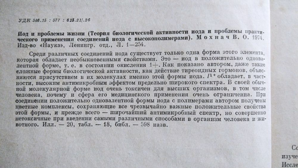 Содержание монографии относится к обширной новой области — изучению биологической активности иода на субмолекулярном уровне. Исследования различных соединений иода с помощью электронных спектров поглощения и других методов дали возможность автору впервые обнаружить и идентифицировать единственную форму иода, которая обладает биологической активностью. В монографии рассматриваются: теория биологической активности иода, лекарственные препараты активного иода, иодинолотерапия.