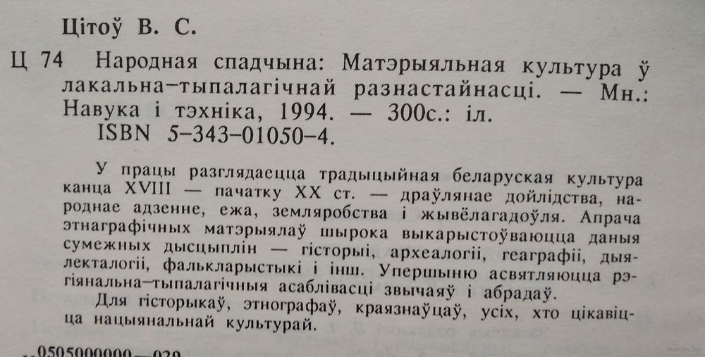 В. С. Цітоў. Народная спадчына: матэрыяльная культура ў лакальна-тыпалагічнай разнастайнасці. Мінск : Навука і тэхніка, 1994 г. 297 с. Цверды пераплет.