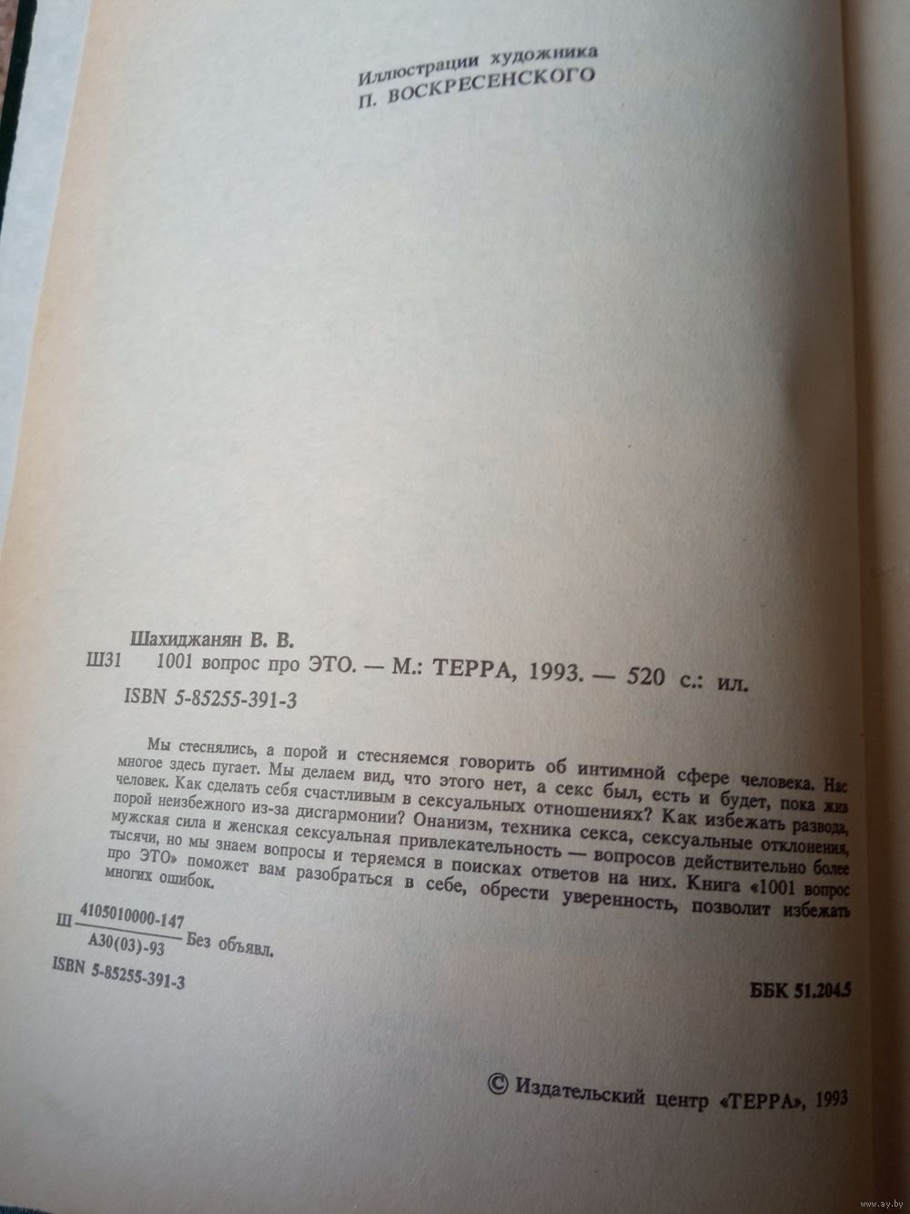 Секс-просвет 90-х гг. от психолога Шахиджаняна в виде вопросов и ответов. В начале и конце есть оторванные страницы, но само содержание не затронуто. Внутри все страницы целые, состояние хорошее.