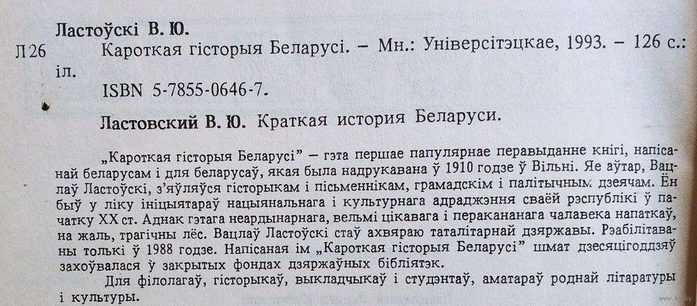 В. Ю. Ластоўскі. Кароткая гісторыя Беларусі: з 40 рысункамі. Выд. факсімільнага тыпу. Мінск: Універсітэцкае, 1993 г. 124 с. Мяккая вокладка.