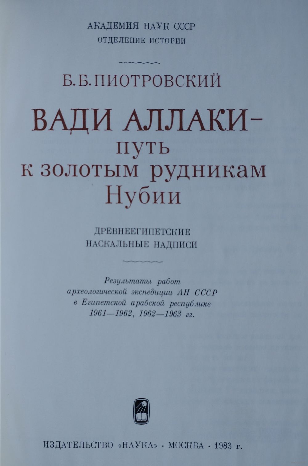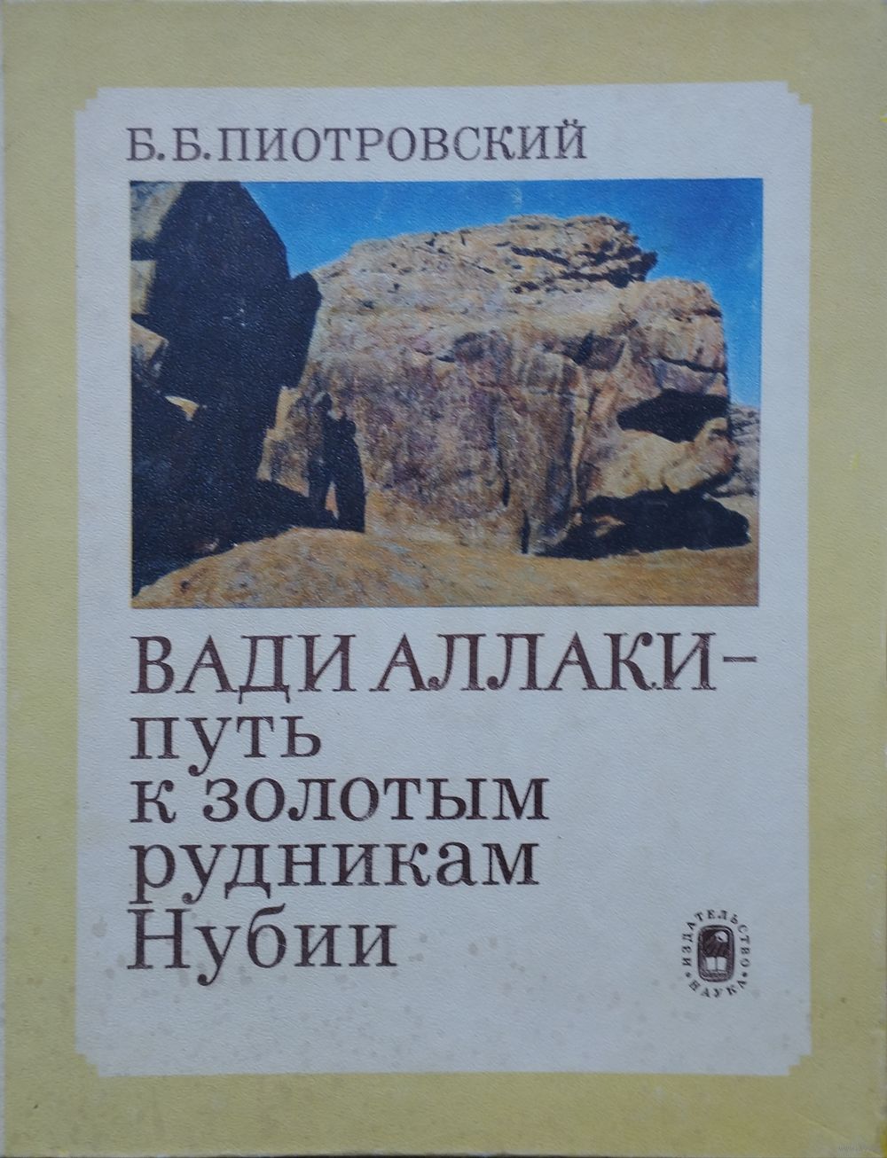 Большой энциклопедический формат. Мелованный альбом. Тираж 4700 экз. 184 стр. Работа академика Б. Б. Пиотровского содержит материалы археологической экспедиции АН СССР 1961-1962 и 1962-1963 гг., выполнявшей по призыву ЮНЕСКО обследование древнеегипетских памятников Нубии. Впервые в полном виде публикуются наскальные надписи Вади Аллаки, даются их перевод и комментарии. Издание содержит ценную информацию по истории Египта, в частности, по организации экспедиций к золотым рудникам Нубии.